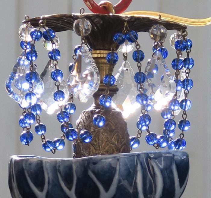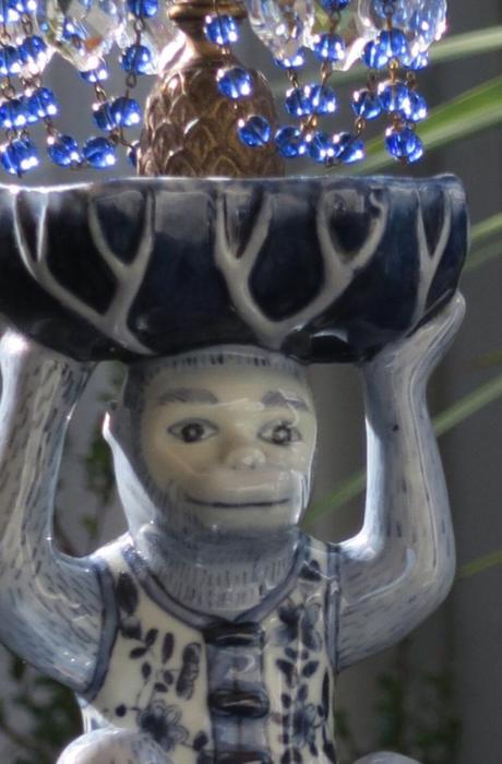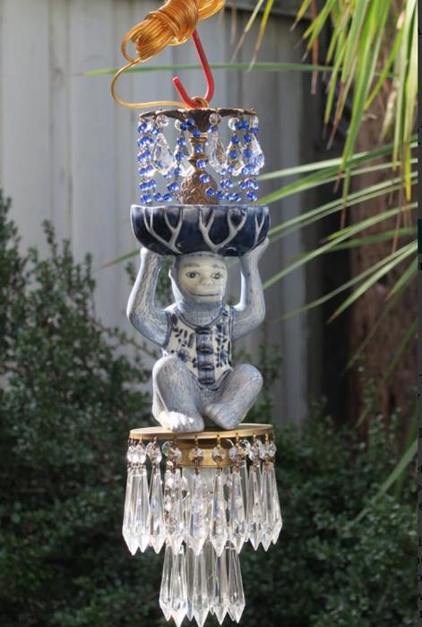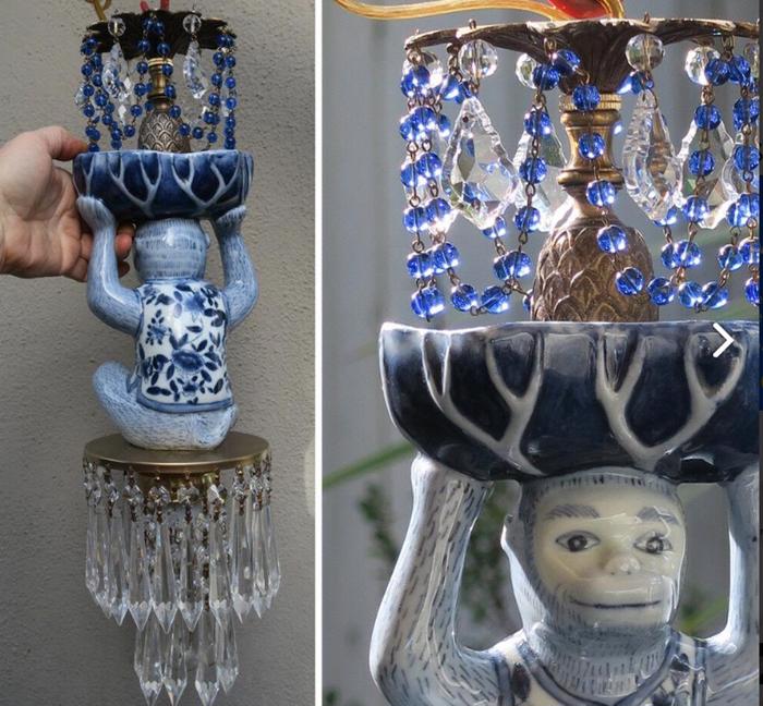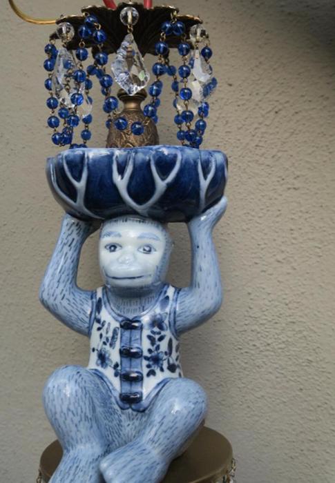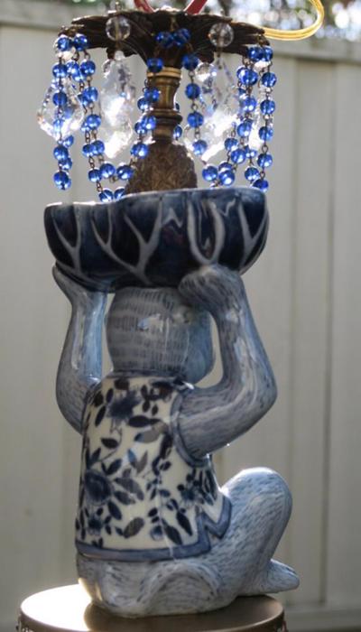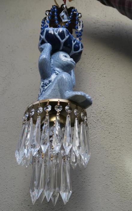 Vintage Asian Monkey Swag lamp chandelier brass & Tole metal with enameled hand- painted porcelain Monkey ~Palm~ Beaded hanging lamp ~New wiring~ Unique - One of a kind! blue berry beads~~With hand-painted Monkey enameled Porcelain sculpture ~ Fountain leaf top beaded crown design.the metal is a combination of brass and tole metal painted gold tone. The leaf crown is adorned with smooth blue bead garlands; Double tiered crystal prisms bottom; New wiring and porcelain socket; Great working order, large clear Icicle prisms that put out rainbow sparkle with shine! All prisms are in great condition, no missing or broken prisms or beads. Porcelain in great condition. The sale is for One Monkey swag chandelier. It is a swag lamp fixture and comes with a 9' foot long cord with switch in line and plug at the end (no chain, but you can always add it if needed) and is ready to hang in your home; The Fixture uses a standard base size bulb - up to 150 watt . (not incl.) Please see photos, they part of description.The chandelier measures total with prisms about 19.5" tall by 6" at the widest point