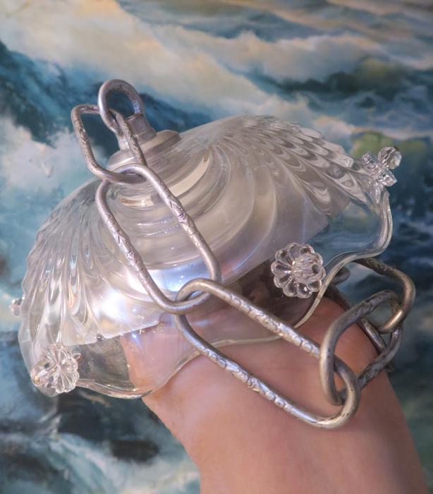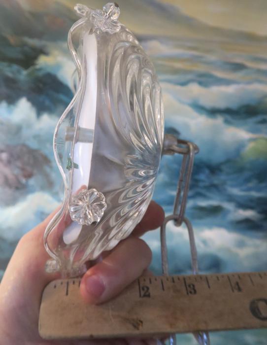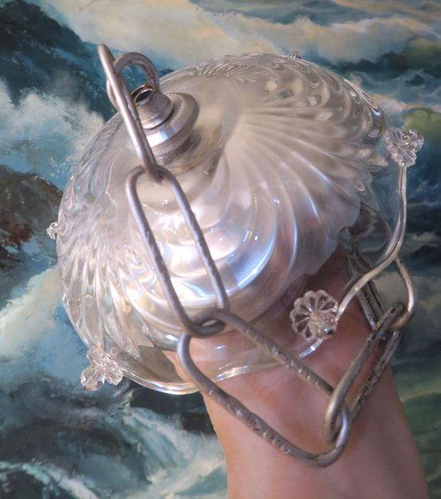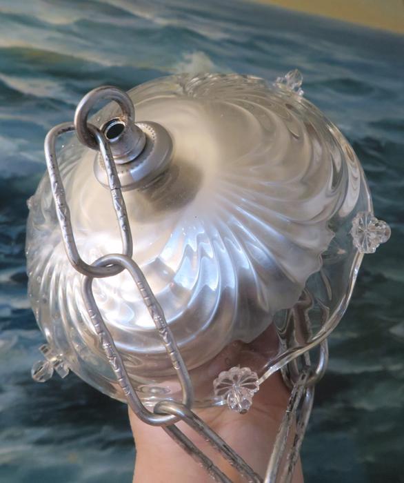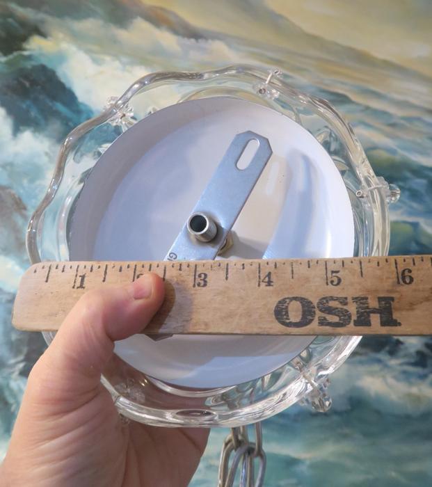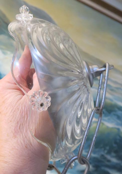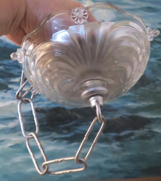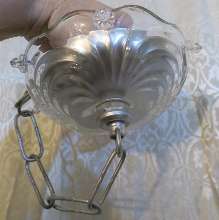 An old Tole Vintage large cut clear crystal silver tone metal canopy gilt chain lamp chandelier part, jeweled with clear glass florettes flowers around it. Please refer to the photos for the measurements****Measures about 6" round and the ornate chain Measures about 12.5" long. Brass and Tole metal ceiling cap with cut crystal clear-glass; Great, perfect condition no chips cracks or any problems - as shown - ready to use. The sale is for one set as shown. In Excellent condition!