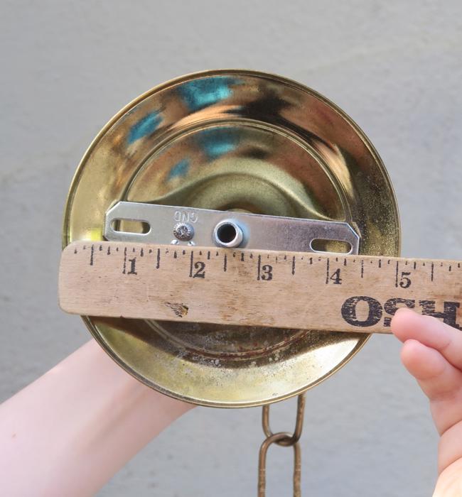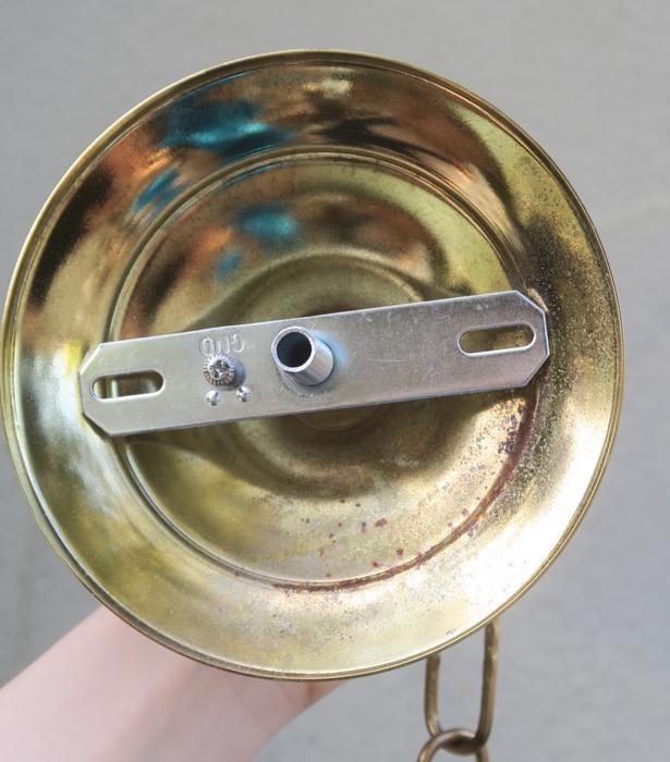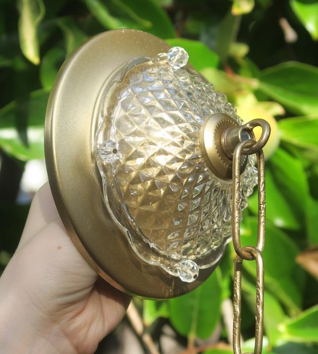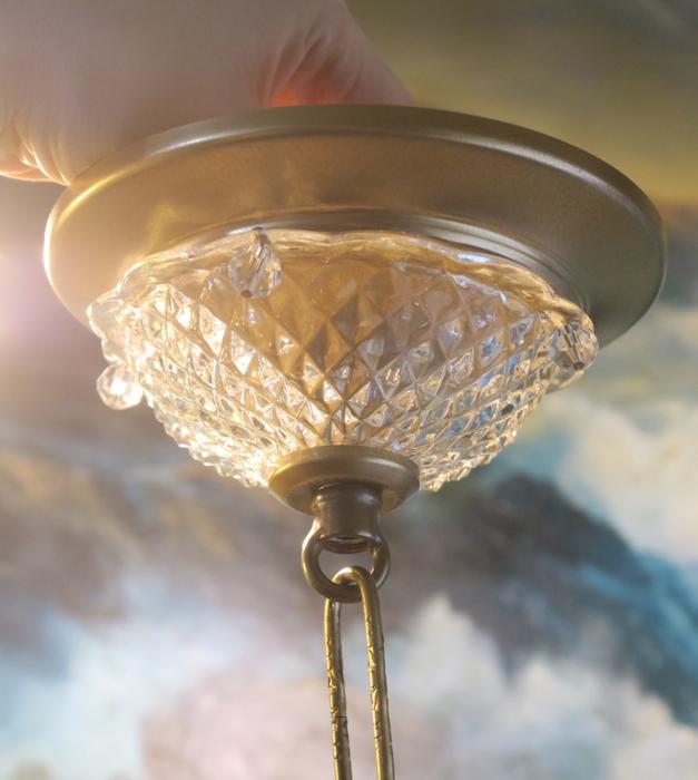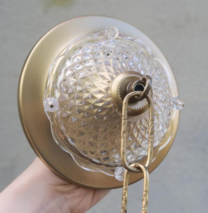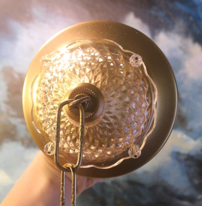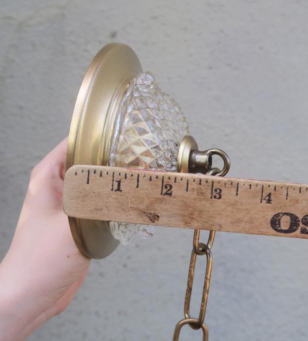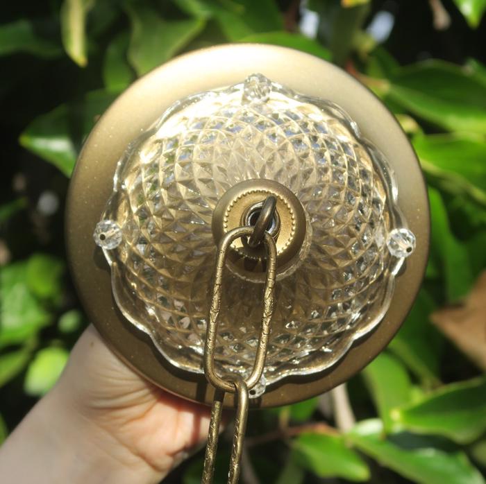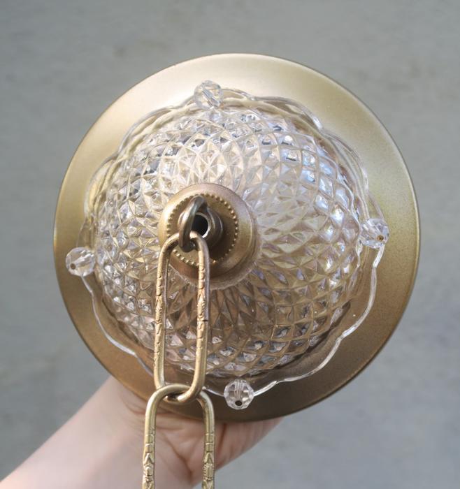 Please refer to the photos for the measurements**** the ornate chain Measures about 12.5" long. If a longer chain is needed - let me know. Gold tone Tole metal ceiling cap with cut crystal clear-glass and beads with florettes; Great condition, no chips cracks or any problems - as shown - ready to use.