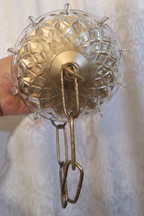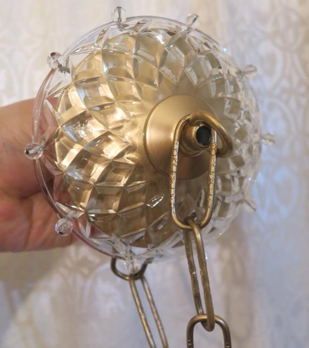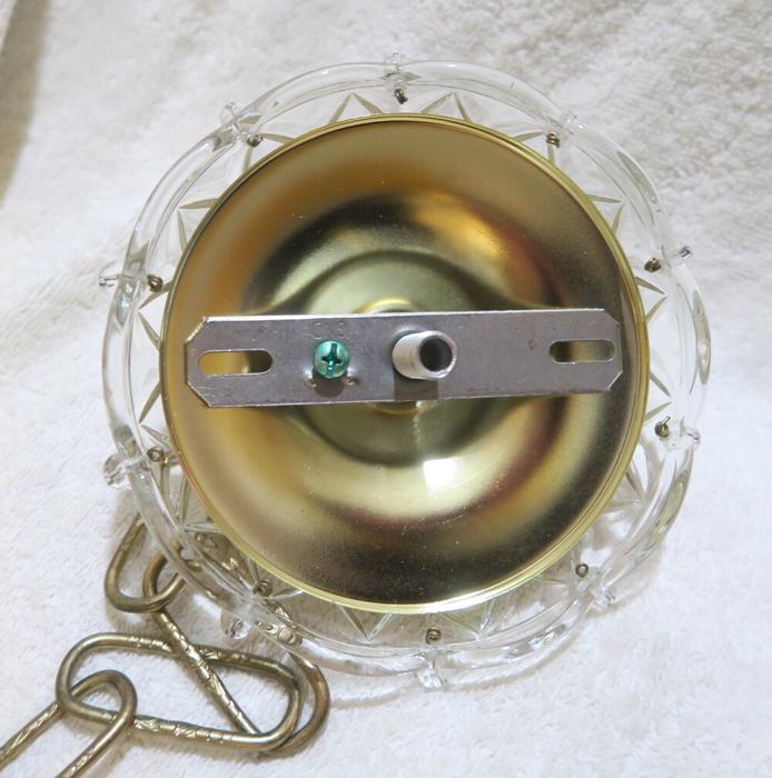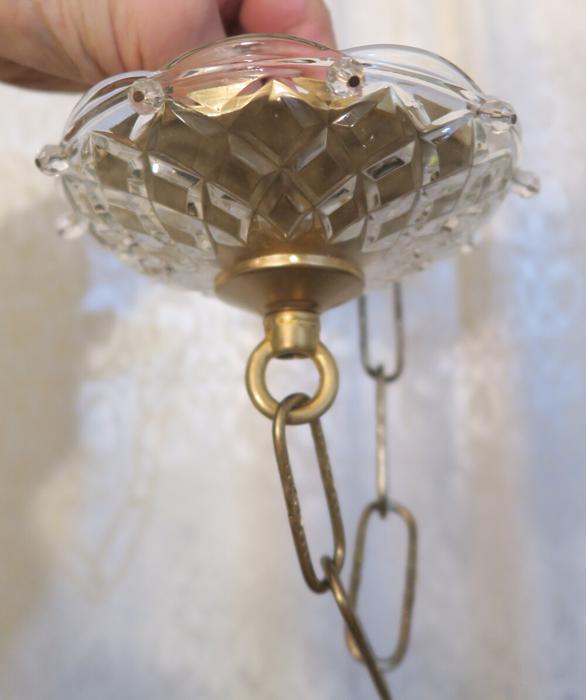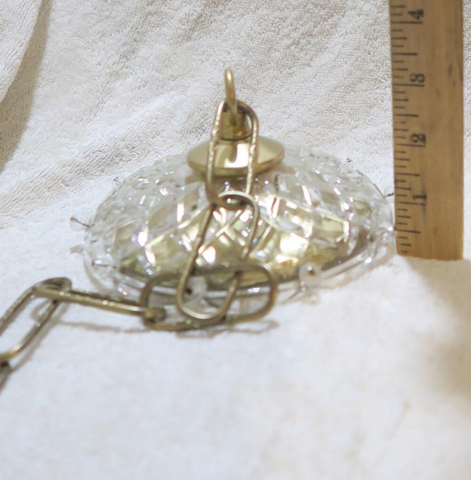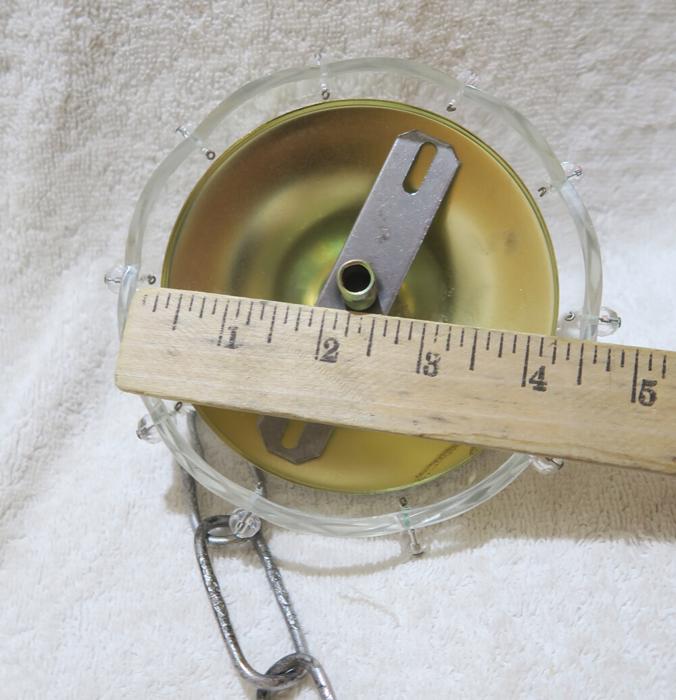 Please refer to the photos for the measurements**** the ornate chain Measures about 12.5" long. If a longer chain is needed - let me know. Gold tone brass and Tole metal ceiling cap with cut crystal clear-glass; Great condition, no chips cracks or any problems - as shown - ready to use.