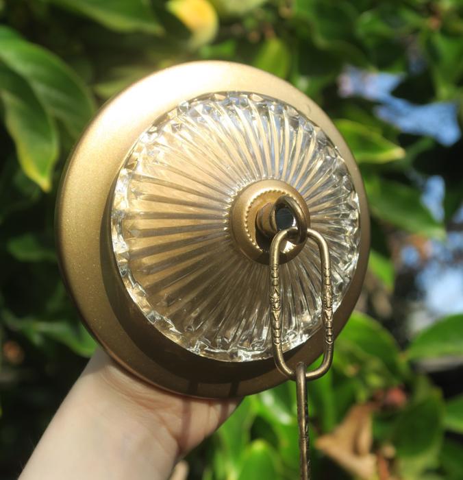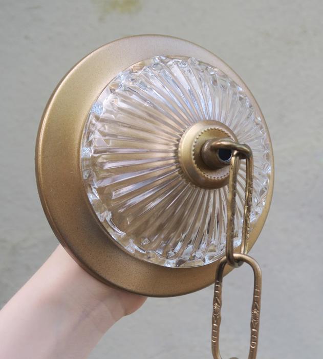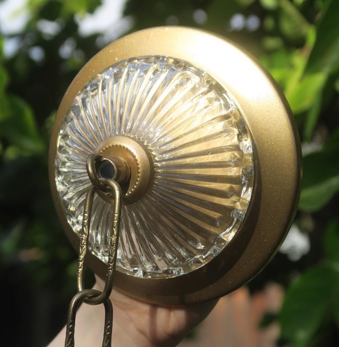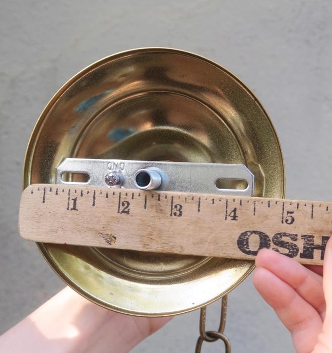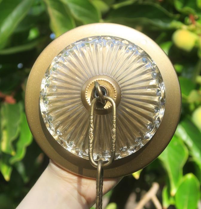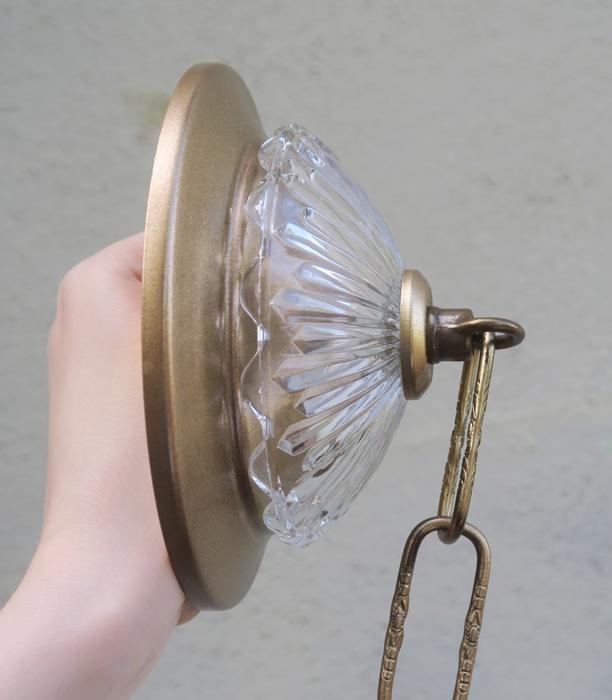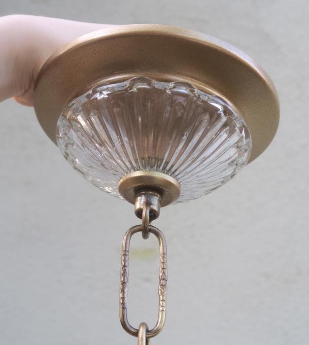 Please refer to the photos for the measurements**** the ornate chain Measures about 12.5" long. If a longer chain is needed - let me know. Gold tone Tole metal ceiling cap with ribbed crystal clear-glass; Great condition, no chips cracks or any problems - as shown - ready to use.