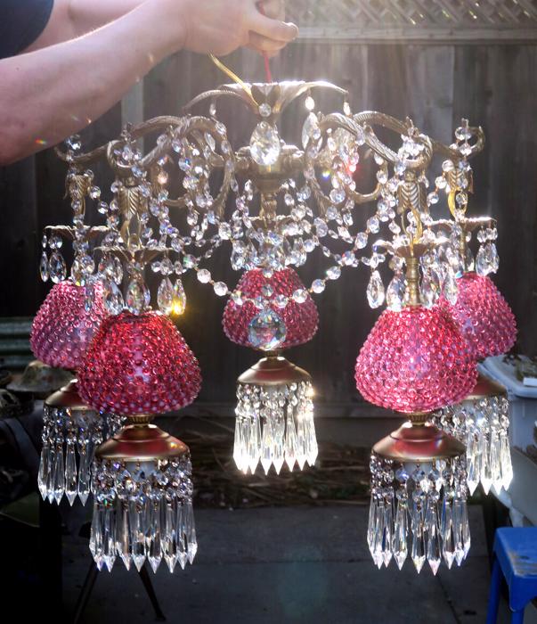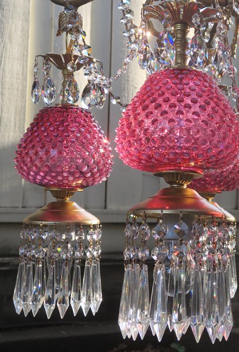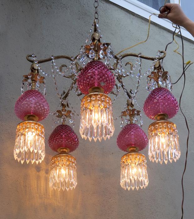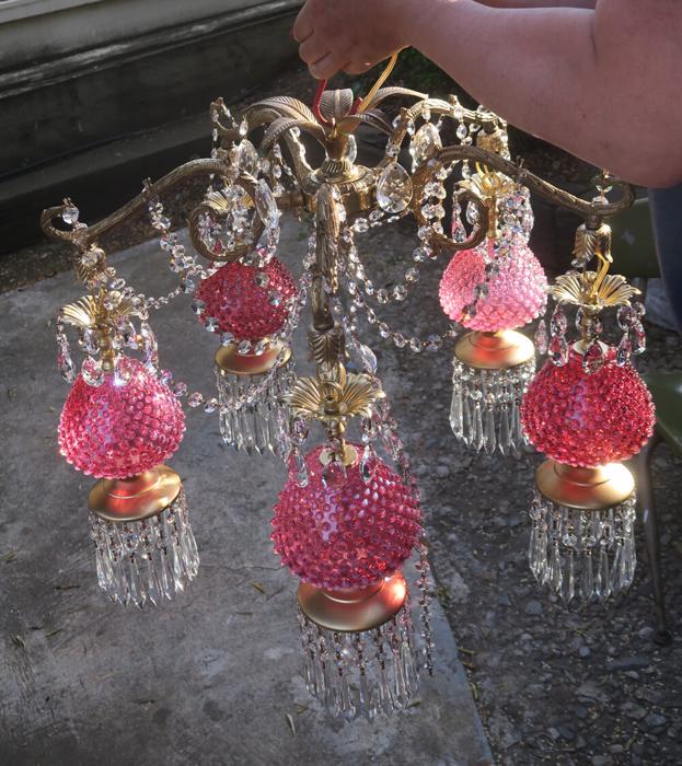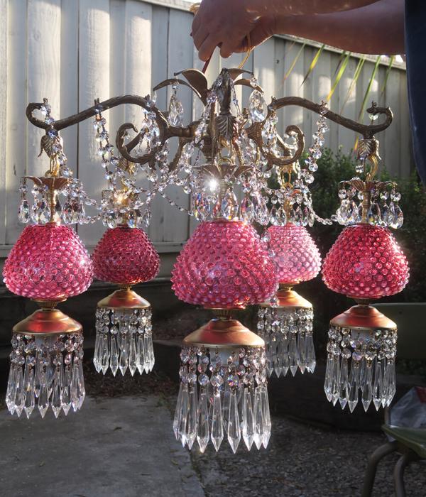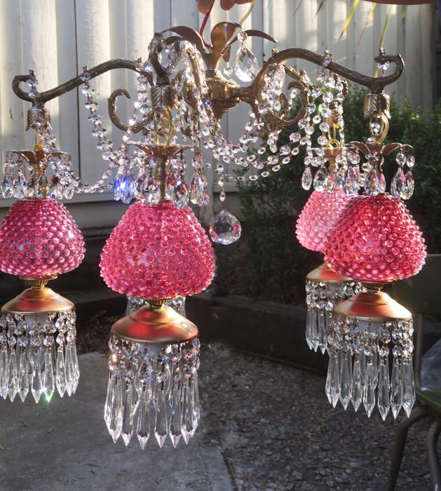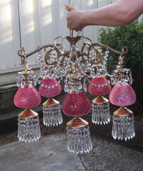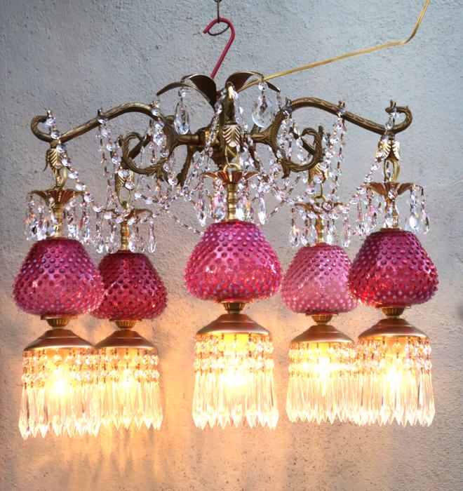 Beautiful 5light Vintage cranberry art glass Fenton opalescent hobnail gilt Brass/Bronze hanging ceiling chandelier Hollywood Regency Inspired with lily top design, New wiring5 lite Vintage hanging Chandelier~ Sparkling clear Prisms Cascading in tiers~ brass cast gilt metal, Cranberry opalescent art glass Fenton globe inserts ~ new wiring and sockets, UNIQUE~ Crown ornate Lily flower top with dripping prisms and cascading lanterns. The metal is cast brass/bronze and tole metal with gold tone. This ceiling lamp fixture takes standard base size bulbs - 5 of them up to 150 watt each (not incl). New wiring and porcelain sockets; Comes with chain and ceiling cap and is a ceiling fixture with canopy. Fully working condition; No cracked broken pieces. All prisms and are intact, no chips, cracks etc;Total with prisms measures about 25" tall x 22" wide, each lantern is 15.5" tall by 5" wide each Fenton glass measures about 5" tall by 5.25" widecomes with canopy and chain that adds extra length to this chandelier
