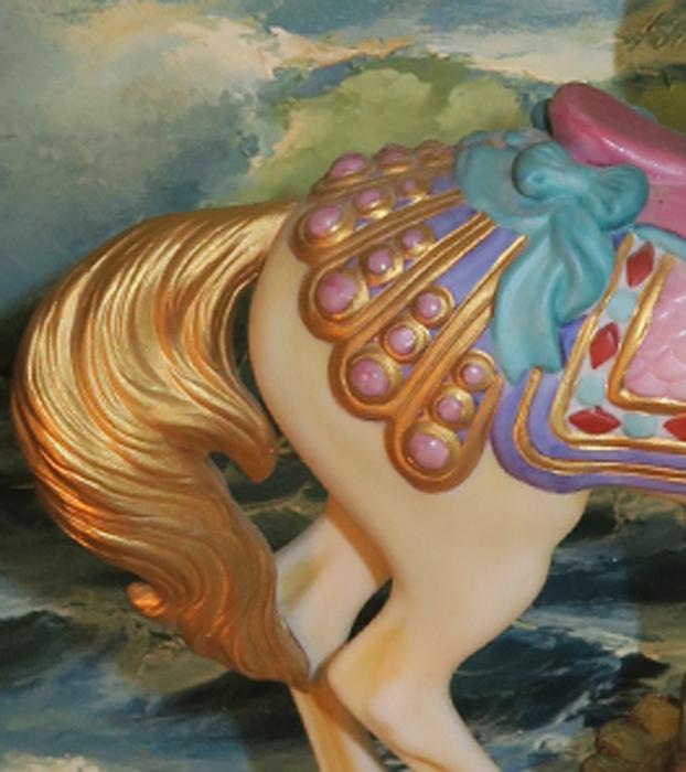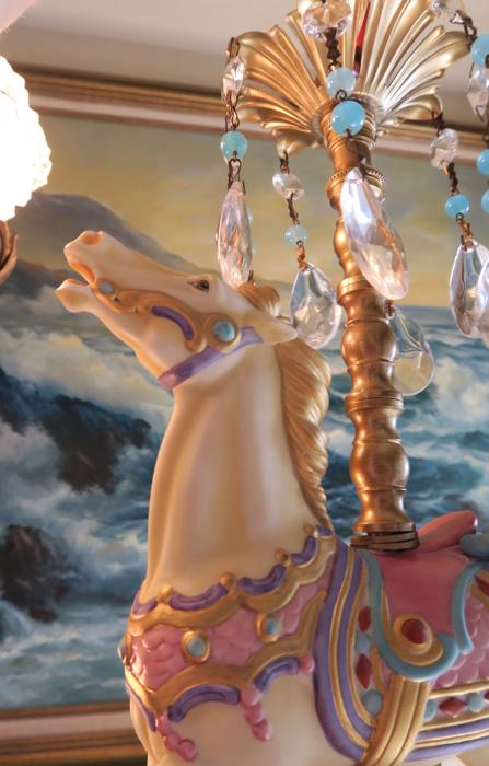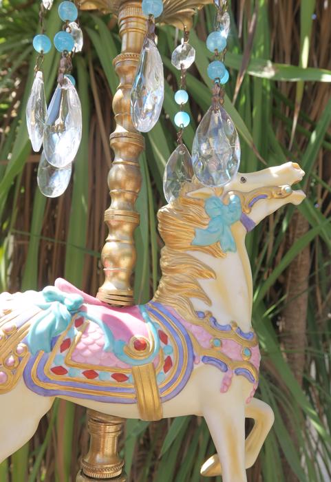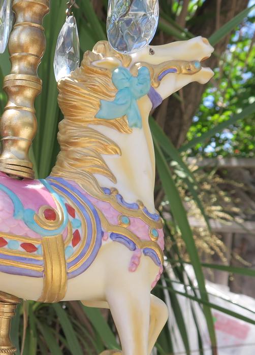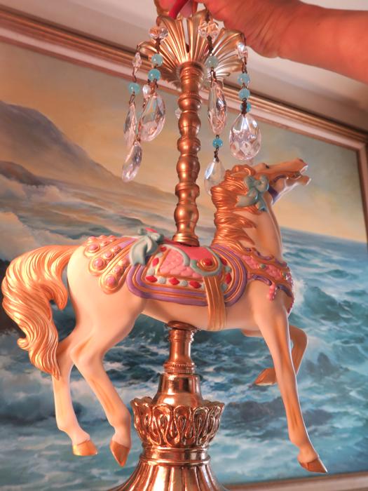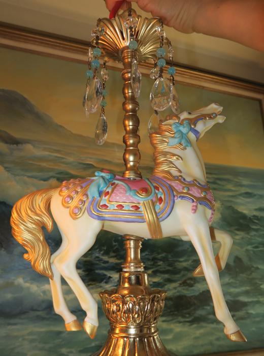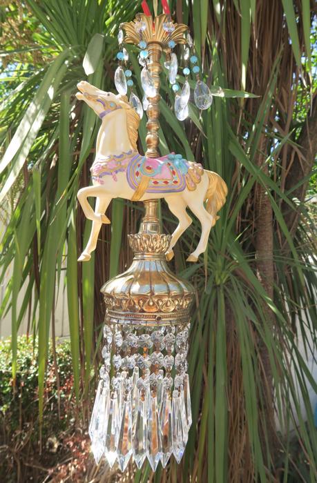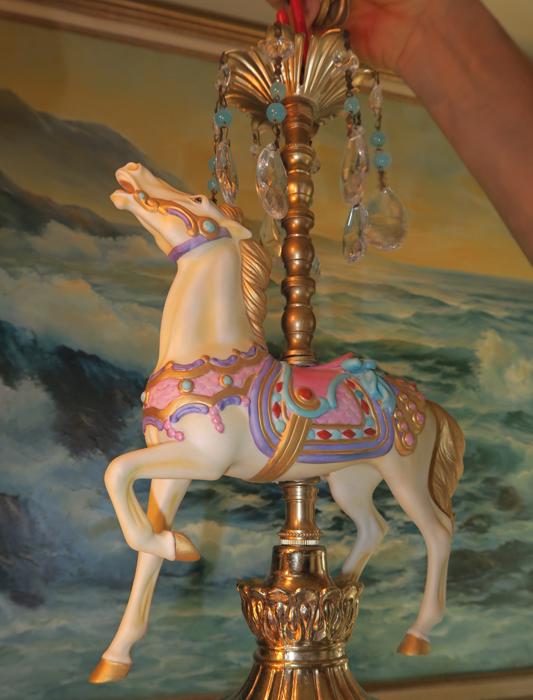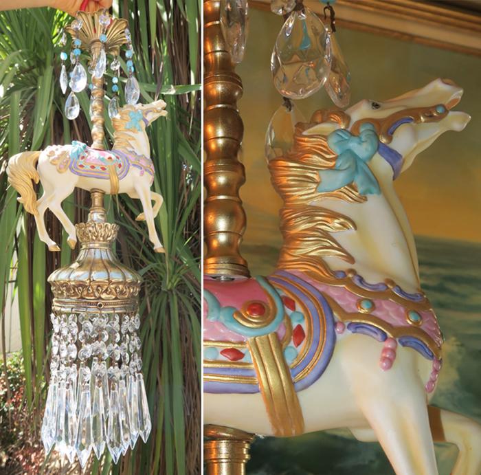 A beautiful porcelain Carousel circus horse on the post. All handpainted with original gilding and raised jeweled details; Fountain of dripping clear grass crystals at the top bobeche with beaded opaline blue macaroni bead prisms. The metal is a combination of tole and cast spelter brass plated metal and brass. New wiring and porcelain socket; The lamp has a loop at the top and is a ceiling install fixture lamp that comes with 35" inch long cord with canopy set with mounting hardware and 12.5" chain length- ready to install in your home. The sale is for one fixture only - as shown. Fully working condition; porcelain horse in great condition; All prisms are intact, no chips, cracks etc. total measures 20" tall by 8" wide