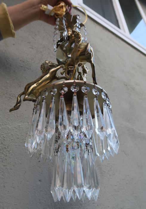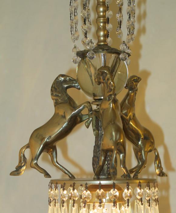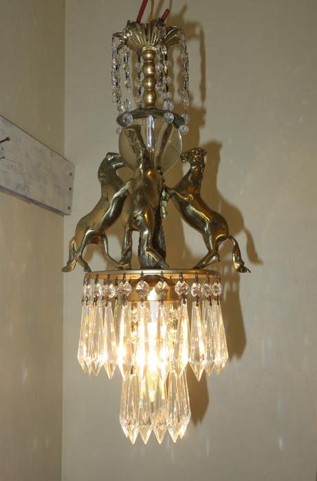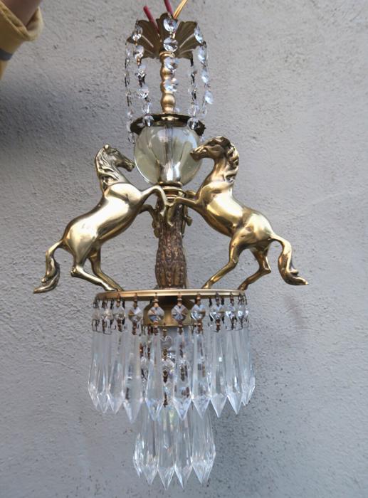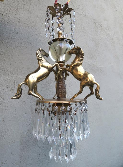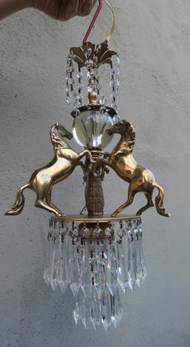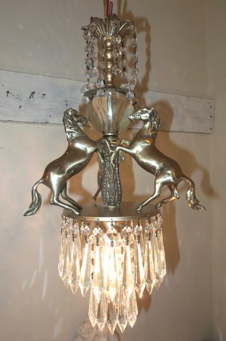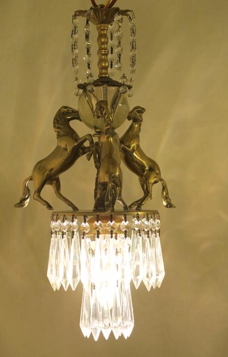 Beautiful swag plugin chandelier-dripping with Sparkling , Glitzy .... European Crystal Prisms; There are three cast brass figural horse sculpture around the center. Two tiers of large Icicle prisms around the bottom of the fixture; Fountain of dripping crystals at the top bobeche. The metal on this lamp is a combination of brass and tole metal with painted gold tone finish. The chandelier is a 1 light fixture, that takes a standard base size bulb up to 150 watt (not incl). New wiring and porcelain socket; It is a swag plugin fixture, comes with 9' foot long cord with switch in line and plug at the end and you can hang it anywhere in the room and plug into a wall outlet. The sale is for one fixture only - as shown. Fully working condition; All prisms are intact, no chips, cracks etc. the Clear glass insert is also in great condition.total measures about 19" tall x 9.5" at the widest bottom point, and horses are 6" tall