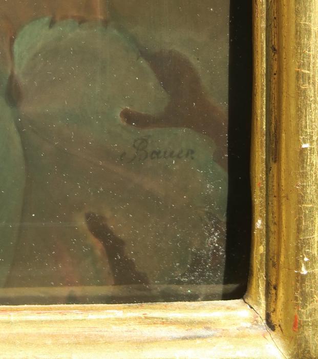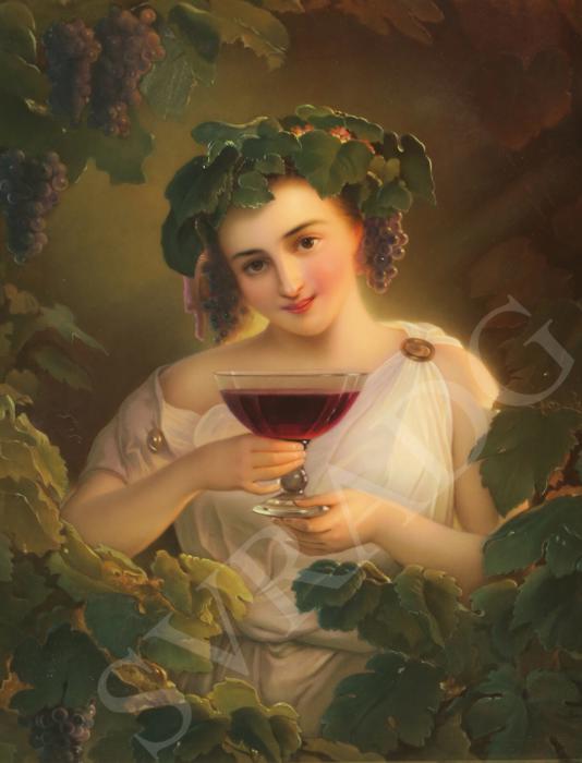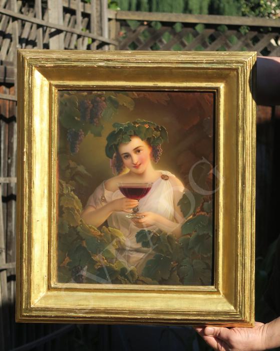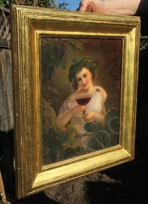 Large Antique KPM Porcelain Berlin plaque carved wood signed Bauer Antique KPM Berlin porcelain plaque set in original period gilt wood watergilt frame ~ Fully marked With KPM Scepter mark, 100% handpainted, excellent mint condition Signed: Bauer Subject: Young girl holding a glass of Red wine with grape vinyard on teh background and grape leaf tiara on her hair; The plaque is marked KPM mark impressed on the back. The plaque is in absolutely perfect mint condition, no chips cracks or scratches; Please note that any white specs on the porcelain are dust or camera reflections. The watergilt carved wood frame is original to the piece old and has all original bright gilding. the frame is in great antique condition with no missing pieces, original gilding with reddish patina showing under the gilding Please see photos they are part of description. Please disregard the white specs of dust and camera glare on the photos; The frame has an original Gold leaf water gilding and is all carved wood and is done in the vine branch like pattern, shabby charming look. Shipping to US is via UPS ground insured, with signature confirmation serviceAll the measurements are shown on the photos; The plaque alone measures about 15.5" by 13.5"