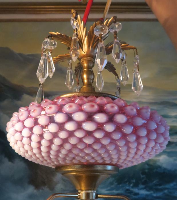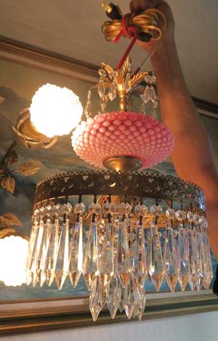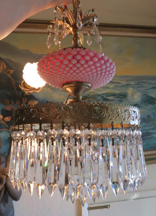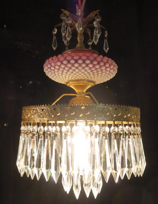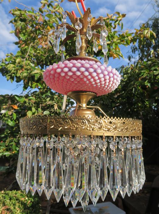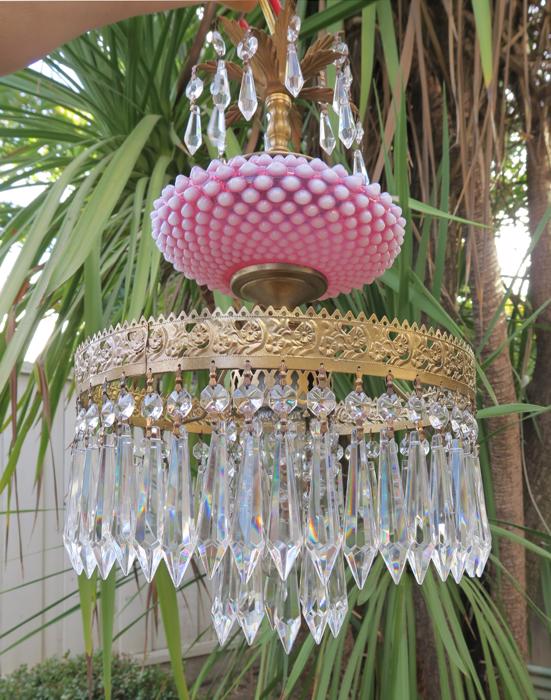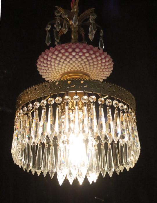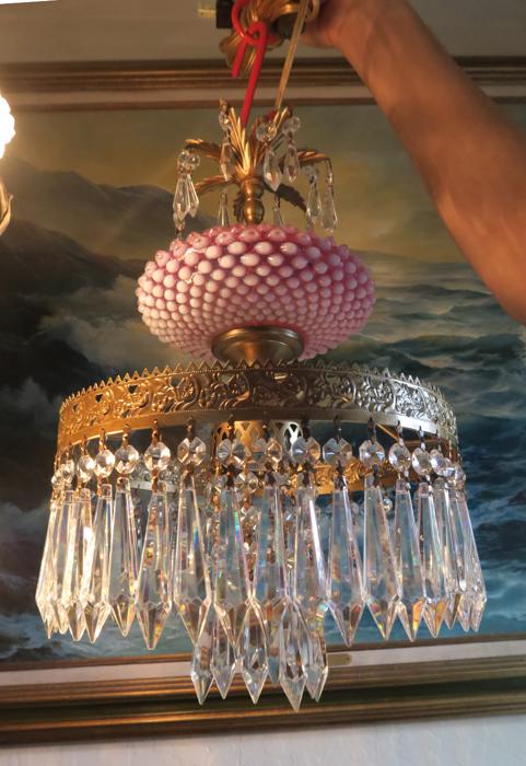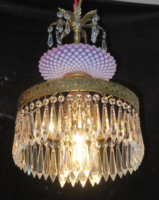Beautiful chandelier-dripping with Sparkling , Glitzy .... European Crystal Prisms. Relief all over the large Fenton Cranberry Hobnail Opalescent Glass insert-see photos. Delicate Nouveau style metal ornate leaf bobeche at the top with dripping crystal prisms. Very unique design with tiers and tiers of Cascading tear drop Clear crystal prisms. Pierced Filigree designs on the gilt ring with dripping crystal prisms. This pendant hanging fixture takes a standard size bulb up to 150 watt (not incl). Comes with 9' foot long cord with switch in line and plug at the end and is a swag lamp. New Wiring! The sale is for one fixture only. I do have multiples. Fully working condition; No missing, cracked broken pieces. All prisms and Fenton cranberry insert are intact, no chips, cracks etc. All hobs in great condition.The chandelier total measures about 15" tall x 10.25" at the widest diameter;
