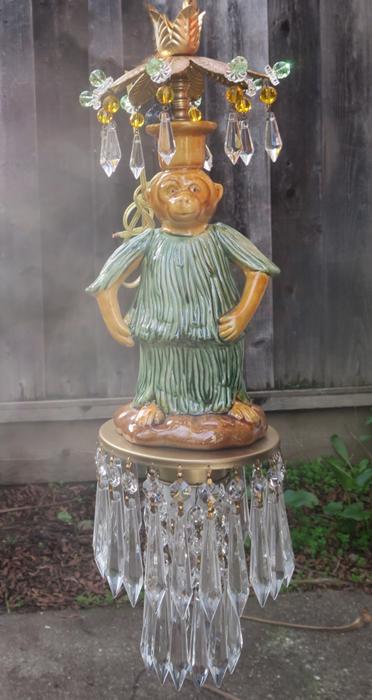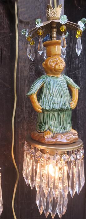 Beautiful ceiling lamp with enameled majolica monkey with blue bird, adorned with crystals and faceted beads~ Leaf top crown design with dripping clear crystal prisms and florettes.The metal is a combination of brass/bronze and tole metal painted gold tone. A crown leaf top above each lantern with beads; New wiring and porcelain sockets; Great working order, large clear Icicle prisms that put out rainbow sparkle with shine! All prisms are in great condition, no missing or broken prisms. The monkey is in great condition and so are the beads. The sale is for a single lamp - as shown. Comes with 35" long cord and 12.5" long chain links, canopy and mounting hardware, ready to hang in your home. Fixture uses a standard base size bulb - up to 100 watt (not incl.) Please see photos, they part of description. The lamp measures total with prisms about 19" tall by 5.5" wide