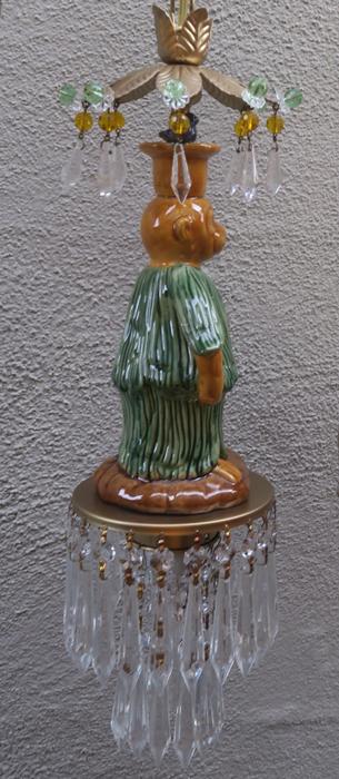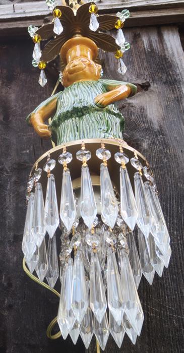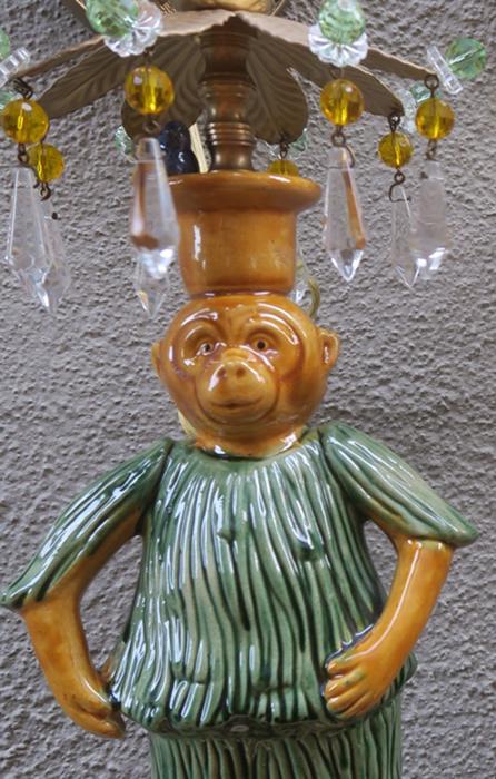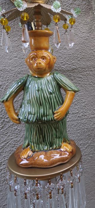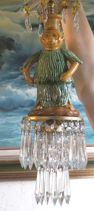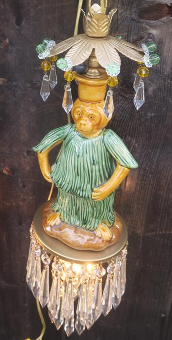 Beautiful ceiling lamp with enameled majolica monkey with blue bird, adorned with crystals and faceted beads~ Leaf top crown design with dripping clear crystal prisms and florettes.The metal is a combination of brass/bronze and tole metal painted gold tone. A crown leaf top above each lantern with beads; New wiring and porcelain sockets; Great working order, large clear Icicle prisms that put out rainbow sparkle with shine! All prisms are in great condition, no missing or broken prisms. The monkey is in great condition and so are the beads. The sale is for a single lamp - as shown. Comes with 35" long cord and 12.5" long chain links, canopy and mounting hardware, ready to hang in your home. Fixture uses a standard base size bulb - up to 100 watt (not incl.) Please see photos, they part of description. The lamp measures total with prisms about 19" tall by 5.5" wide