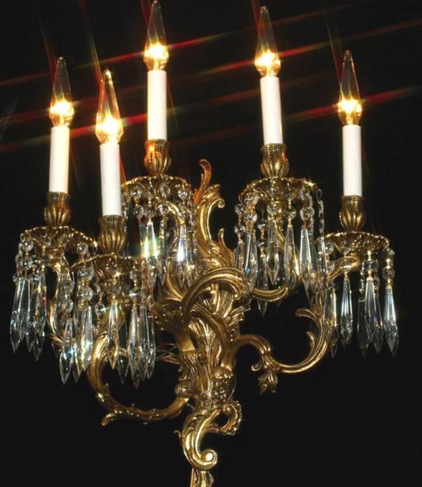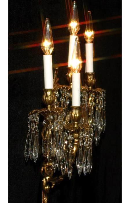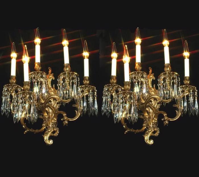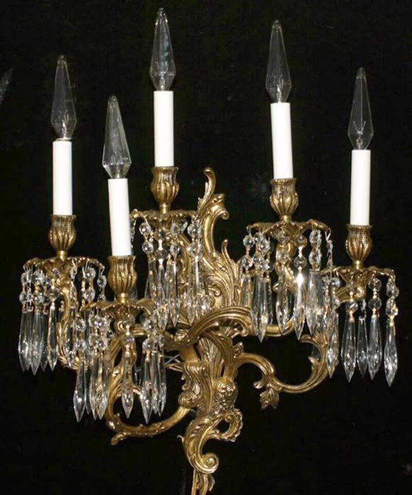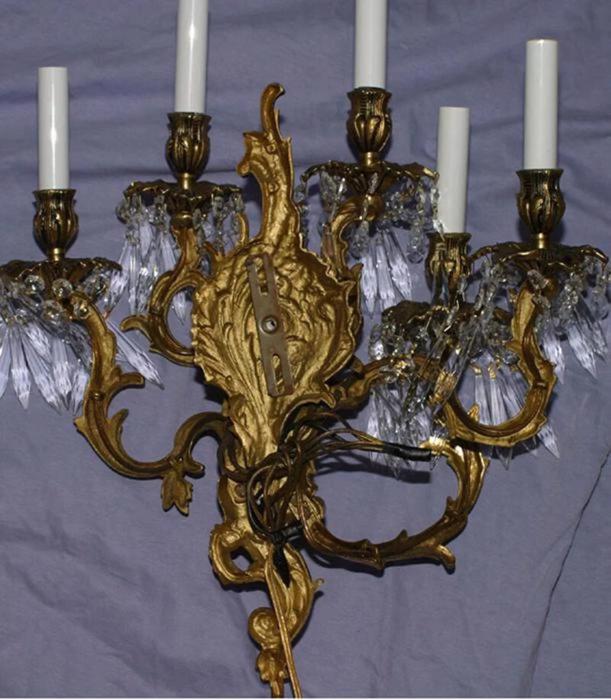 Great pair of Museum quality Large Dramatic gilt plated brass bronze old French Rococo Style ornate 5 light ormolu Sconces ; Acanthus leafs~ wall chandeliers ~ Accent lights~ ~Dripping with Tons of Cascading Clear crystal Prisms and garland swags~An absolutely beautiful pair- the Rococo style Sconces with tons of dripping Crystal Prisms - old vintage. Each sconce is adorned with original clear crystal glass prisms that put out a multi color Rainbow Sparkle shine. The metal is gilt Bronze /brass with original shiny gilt plated finish, still shiny with old charming patina. Beautiful design with acanthus leafs and buds designs on the arms and back plate with ornate open arms with candlesticks designs. Each sconce is a 5 light fixture. Great working order ready for hanging in your home. These sconces can be wired into a wall - as it is a wall fixture and comes with mounting hardware; or, a cords with switch can be added to plug these sconces into a wall outlet and hang anywhere in the room. I believe these vintage sconces would date somewhere from 1940-1950-s. These are European sconces, French Rococo style, either Spanish or French. Sconces use small base chandelier bulbs -5 of them up to 60 watt each (not incl). The sale is for a PAIR - you get two sconces with this sale. No broken or chipped prisms, all intact. Please see photos, they part of description. The sconces measure about 21" inches tall, 18" inches wide by about 6.25" deep