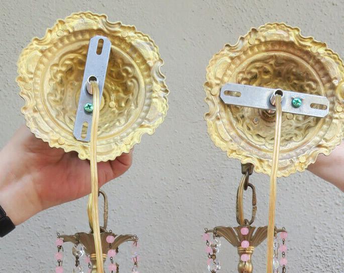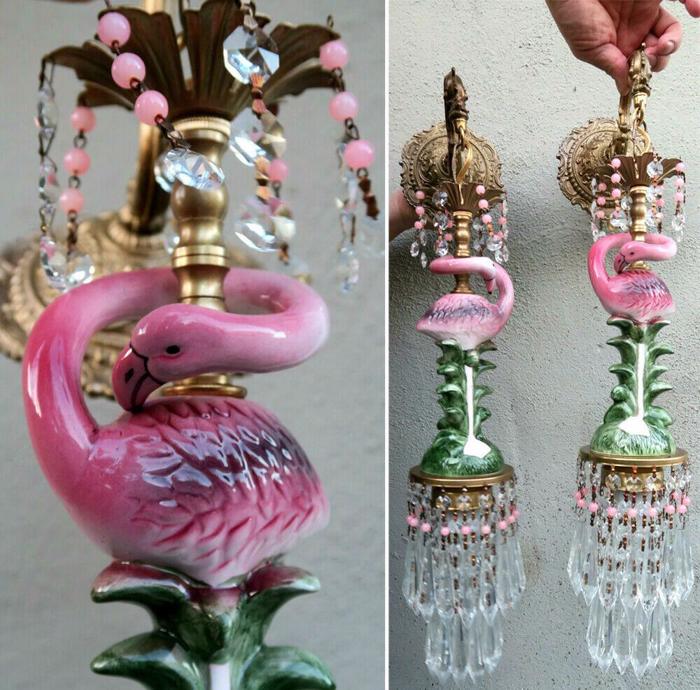 A PAIR- Left and Right Tropical Pink Flamingo birds sconces hanging lantern lamps, Opaline rose pink bead garland strands ~New wiring~~With relief hand painted pink Porcelain Flamingo bird posts all hand painted porcelain~ Leaf top crown design with dripping clear crystal prisms.The metal is a combination of brass and tole metal painted gold tone. A crown leaf top above each lantern it with macaroni opaline pink, and sparkly small beaded French leaf prisms; New wiring and porcelain sockets; Great working order, large clear Icicle prisms that put out rainbow sparkle with shine! All prisms are in great condition, no missing or broken prisms. Porcelain in great condition so are the beads. The sale is for 2 sconces - as shown. These can be installed into the wall or (Cords with switches can be added to them to hang them anywhere in the room and plug into a wall outlet;) Fixtures use a standard base size bulb - up to 150 watt each. (not incl.) Please see photos, they part of description. The sconces measure total with prisms about 25" tall by 4.75" at the widest point and 5" deep. the back plates are 5.25" in diameter