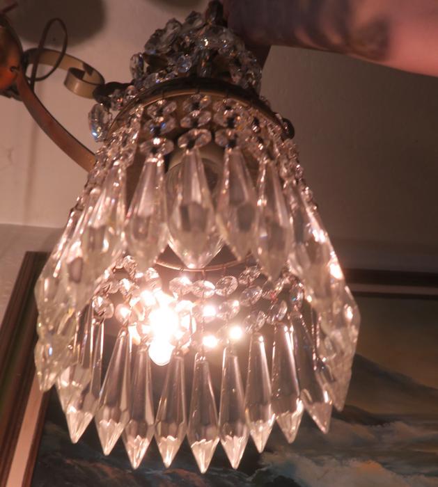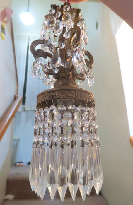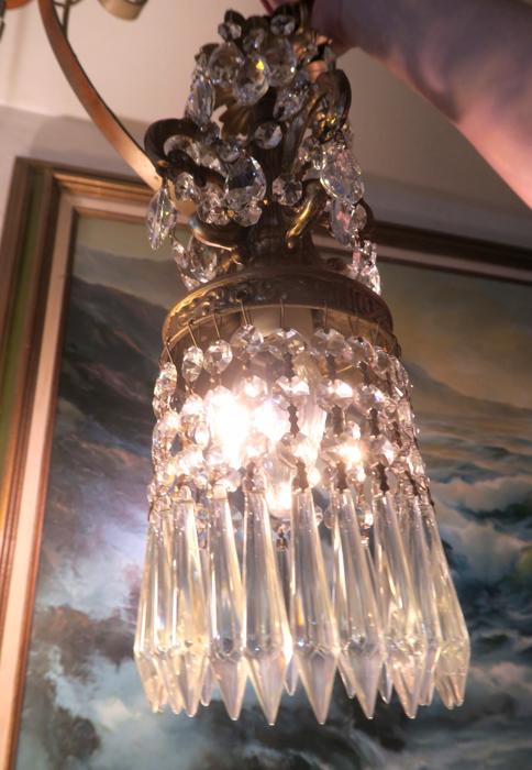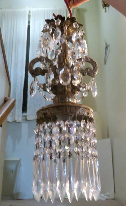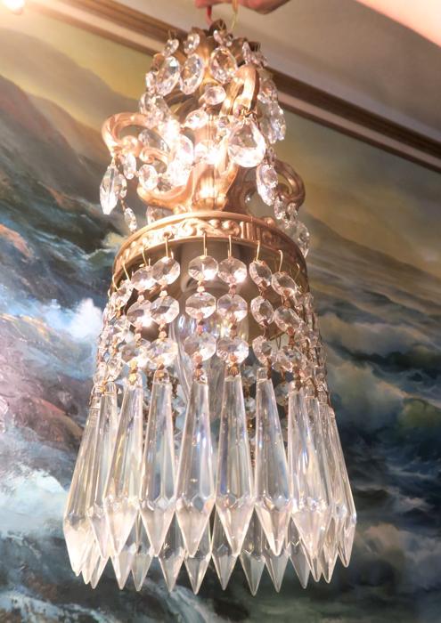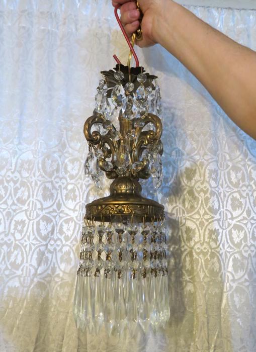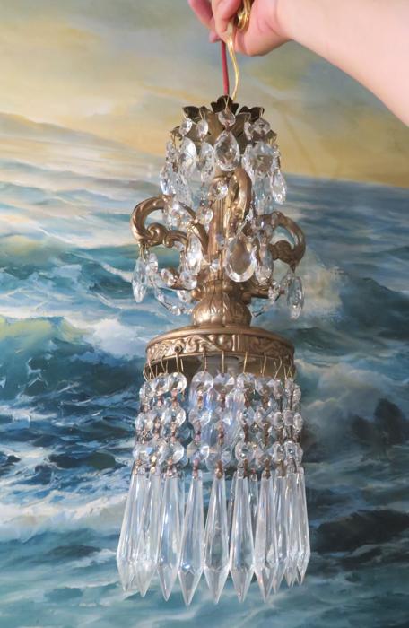 A pair- a LOT of (2) Rococo Style Petite pendant Crystal Chandelier/lamp ~ Sparkling.... European Crystal Prisms! New wiring! Offered is this pair - 2 lamps of Rococo style chandelier-dripping with Sparkling , Glitzy .... European Crystal Prisms. Delicate tole metal leaf bobeche at the top with rococo style designs on the post that are adorned with garlands and Almond shaped crystals. French U-Drop Crystals at the bottom of the fixture. Cast metal is gold plated spelter cast metal with ornate designs. Each petite hanging fixture takes a standard size bulb (not incl). Has a loop at the top for hanging. Each lamp comes with a 35" inch long cord; This sale is for 2 lamps in the lot. These are intended for a ceiling mount and will need canopy sets to install- No canopy is included with this lot, but I do have many different styles of canopy sets available for sale in my store that you can purchase.Fully working condition; New wiring, No cracked or broken pieces. All prisms are intact, no chips, cracks etc. each lamp total with prisms measures about 15" tall x 6.25" at the base point