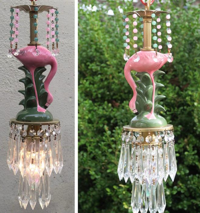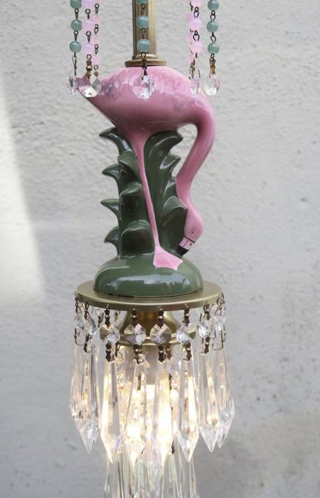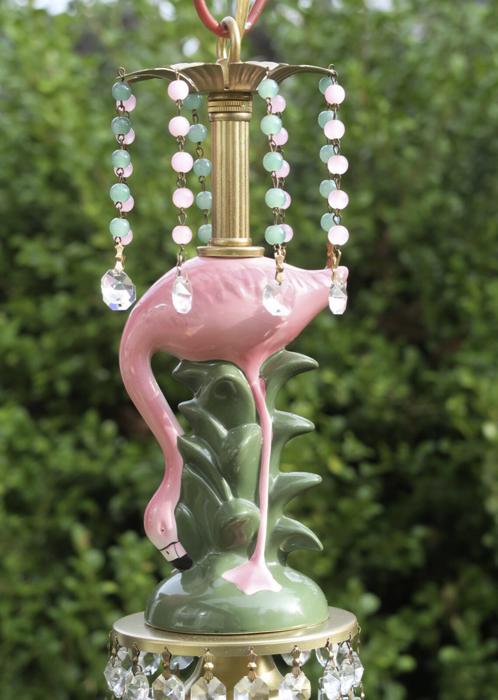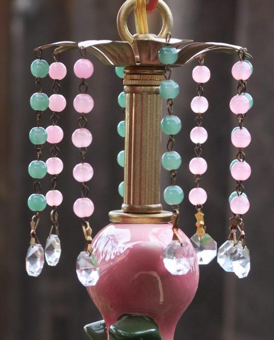 A beautiful, handpainted ceiling install chandelier-dripping with Sparkling , Glitzy .... European Icicle clear glass Crystal Prisms. Glass Opaline Pink and Jade green swag garlands dripping from the top crown leaf; Two tiers of large Icicle prisms around the bottom of the fixture; Fountain of dripping beads and crystals at the top bobeche. The metal on this lamp is a combination of brass and tole metal painted gold tone.The chandelier is a 1 light fixture, that takes a standard base size bulb up to 150 watt (not incl). New wiring and porcelain socket; It is a ceiling install fixture, comes with 30" long cord with a ceiling canopy set with mounting hardware and 12.5" chain length - ready to install in your home The sale is for one fixture only. Fully working condition; All prisms are intact, no chips, cracks etc.total measures about 17.5" tall x 5" at the widest point