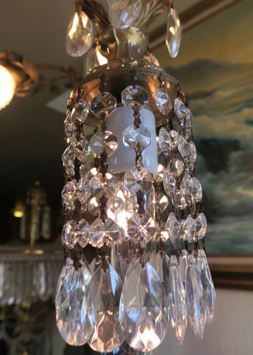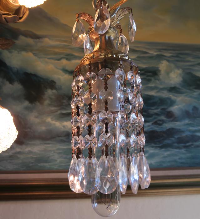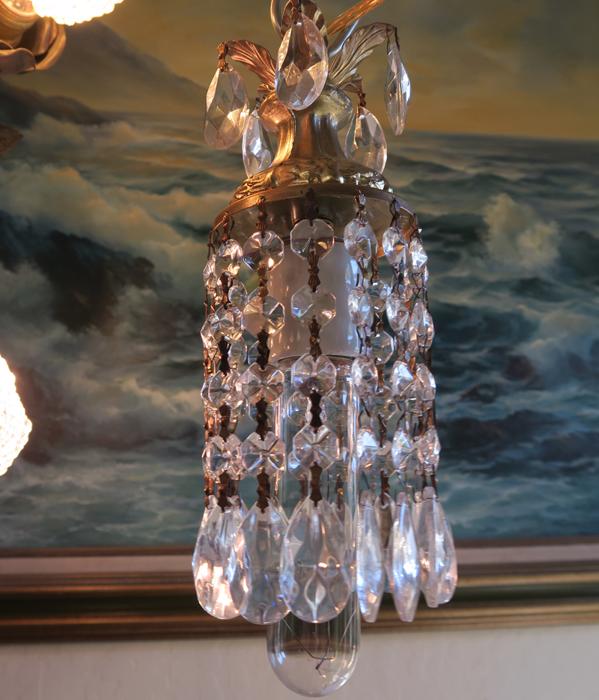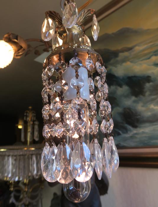 A very cute petite small lamp dripping with Sparkling , Glitzy .... French icicle shaped European Prisms. Delicate metal leaf bobeche at the top with crystal prisms. The metal is a combination of spelter like metal with toleware metal painted gold tone; This hanging fixture takes a standard base size bulb up to 150 watt (bulbs Not included). Please note with different colored bulbs prisms reflect the color - see the photos taken using Red bulb - all prisms are clear , the reflection is for the red bulb; Comes with 9' foot long cord with switch in line and plug at the end so you can hang it anywhere in the room and plug into an outlet. The sale is for one fixture only. Please see photos, they are part of description; email with questions before bidding, thank you! Fully working condition; New wiring, No missing, cracked broken pieces. All prisms are intact, no chips, cracks etc. total with prisms measures about about 11.25" tall x 3.25" at the widest point --not including the bulb size