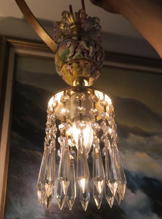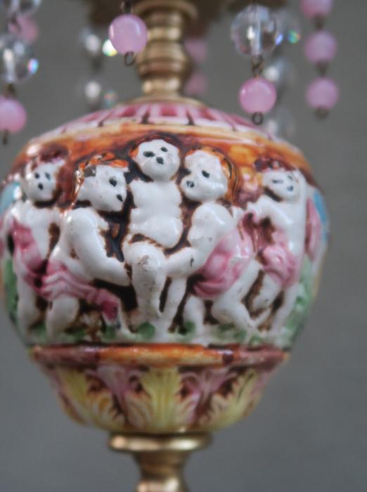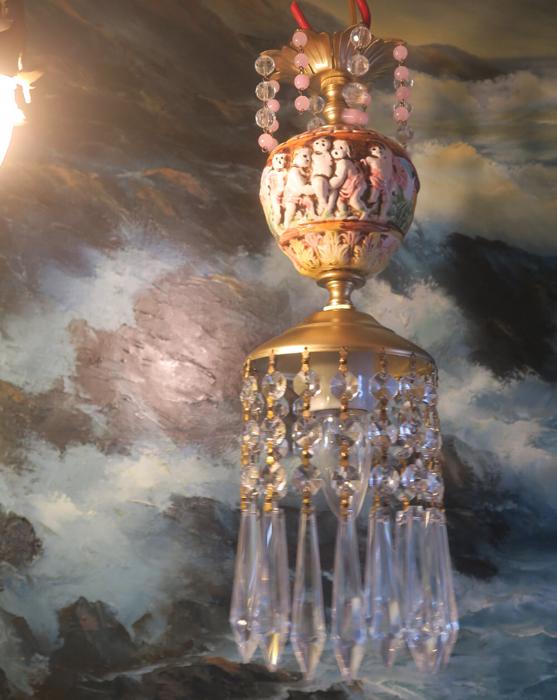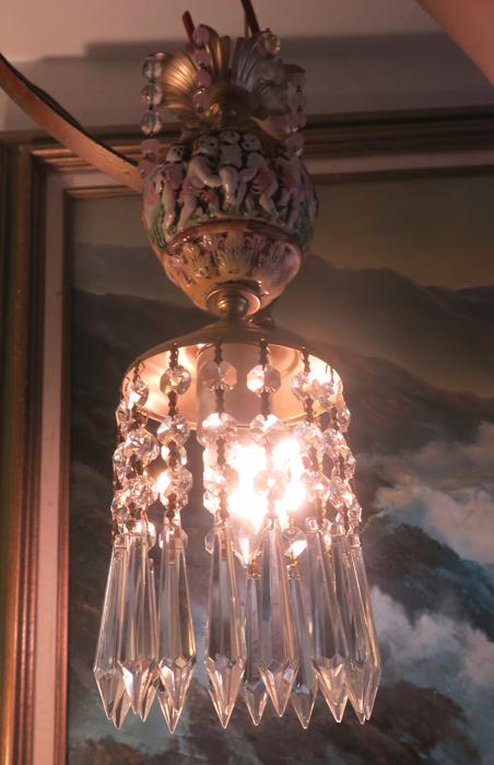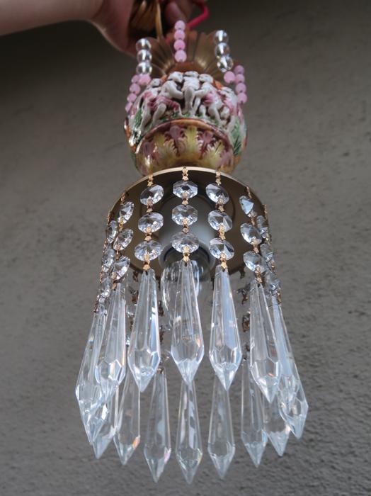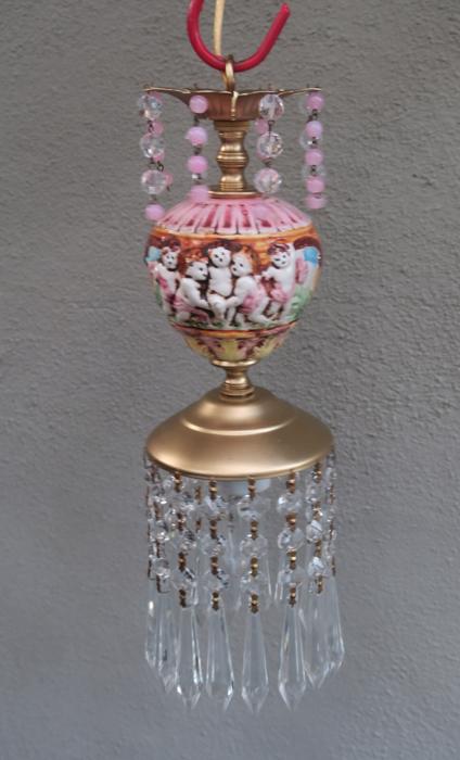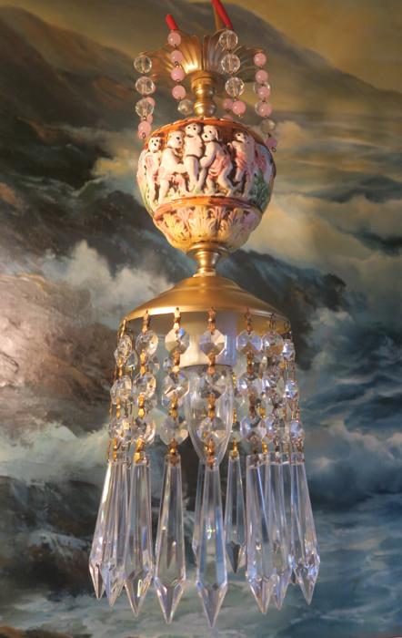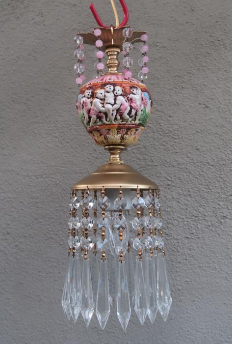 Adorable small foyer hanging lamp-Sparkling , Glitzy. Unique design with porcelain inserts with Capodimonte Porcelain relief cherub designs and tiers and tiers of Cascading French U-drop Clear prisms. Crown leaf fountain top with dripping prisms and cascading Small lanterns. The metal is a combination of brass or bronze and tole metal. This hanging pendant lamp fixture takes standard base size bulbs -up to 150 watt each (not incl). has a loop at the top for hanging and comes with a 9' foot long cord with switch in line and plug at the end- ready to hang in your home; . New wiring and porcelain socket. Fully working condition; No cracked broken pieces. All prisms and are intact, no chips, cracks etcthe lantern is 14.25" tall by 5" wide