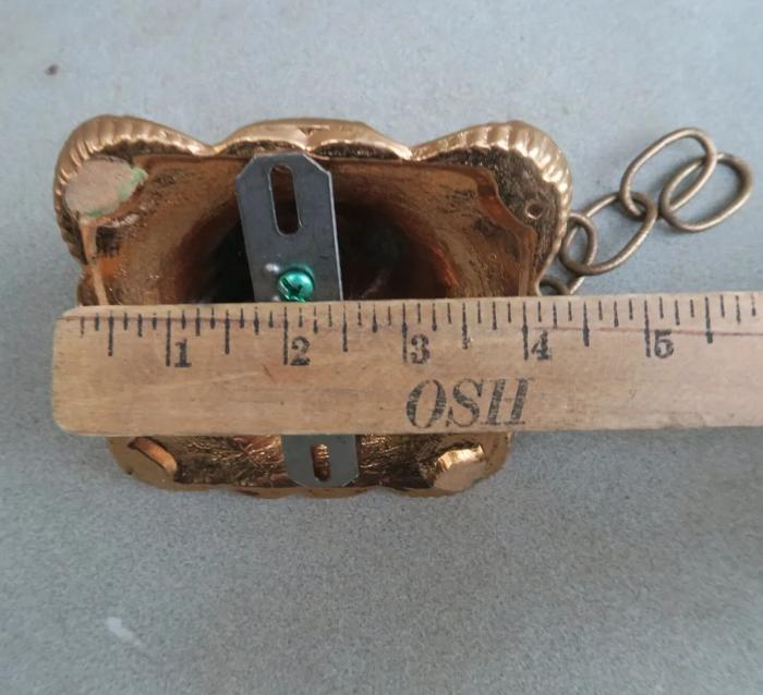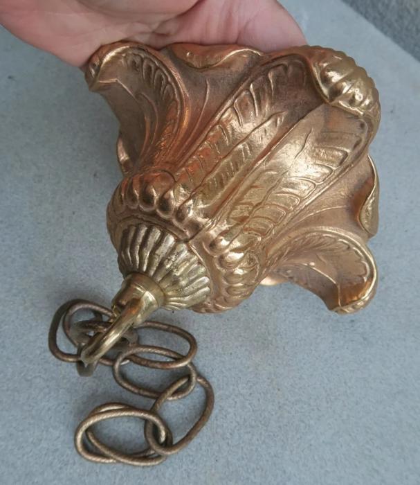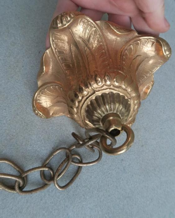 Shabby Vintage cast spelter Brass tone Ceiling canopy with chain hanging lamp chandelier part set, Lily flower Art Nouveau inspired design Please refer to the photos for the measurements**** The chain Measures about 12.5" long. (if a longer chain is needed- just let me know). Lilly canopy with mounting hardware part set - a great part to use to hang your lamp or chandelier; Good condition - ready to use; Please see photos, they are part of description;