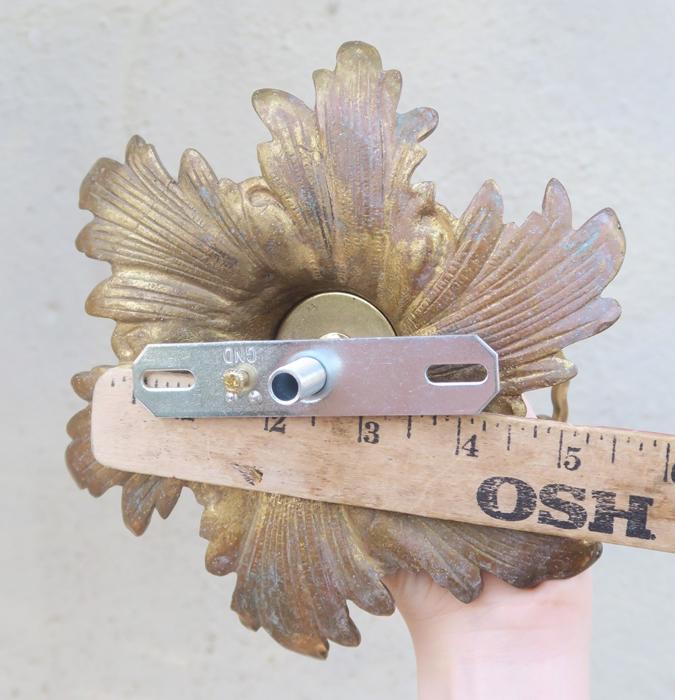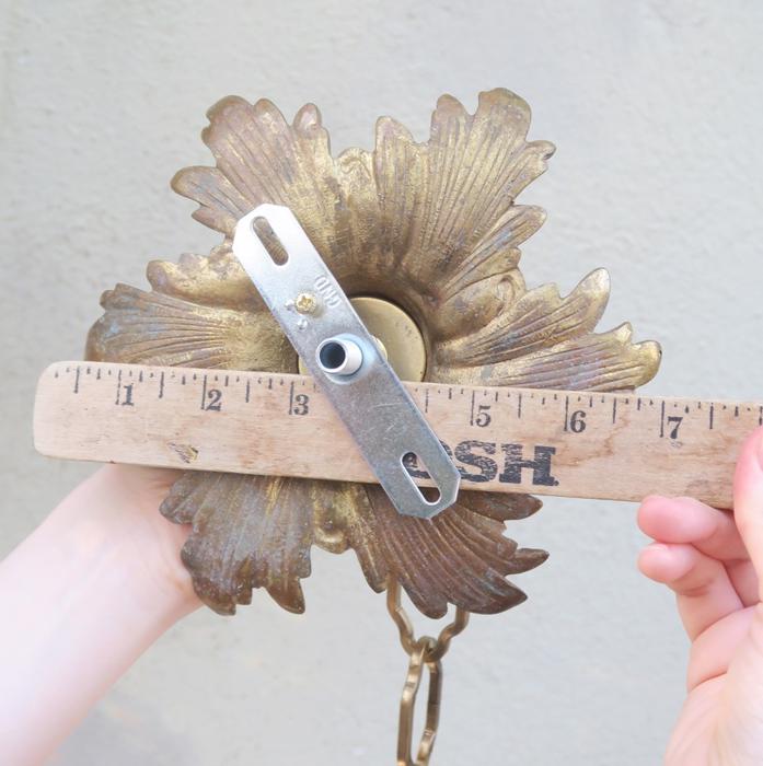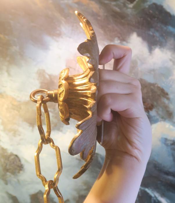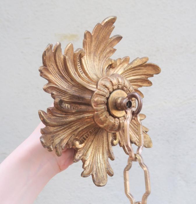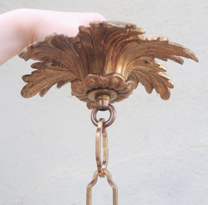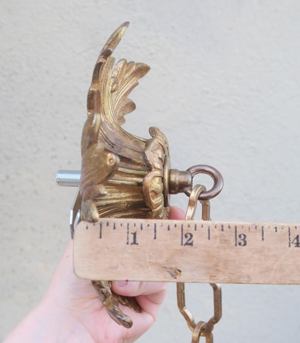 Please refer to the photos for the measurements****The ornate chain measures about 15" long. (if a longer chain is needed- just let me know). Vintage heavy solid cast French Dore bronze with original gilding ceiling cap canopy. Beautiful Art Nouveau design with Acanthus Leaf floral pattern with very elaborate casting. It comes with mounting hardware part set - a great part to use to hang your ceiling lamp or chandelier; the Canopy has an original gilt finish with patina from age and very intricate ornate design with acanthus leaves with relief detailed casting. Heavy great quality piece, Good condition with original gilding - ready to use- Please see photos, they are part of description; the sale is for one set as shown.