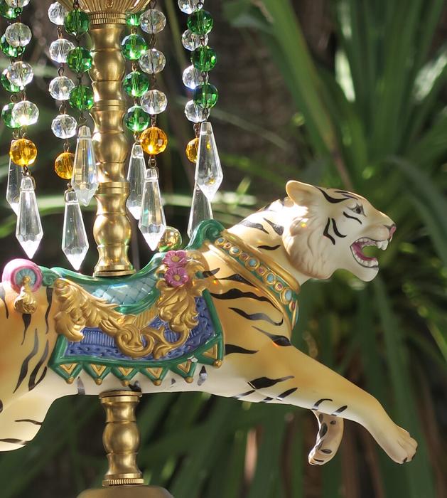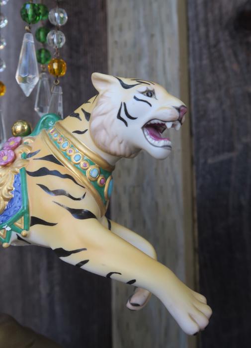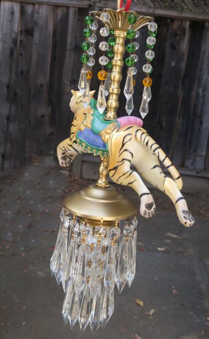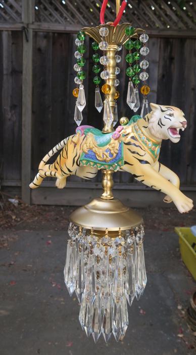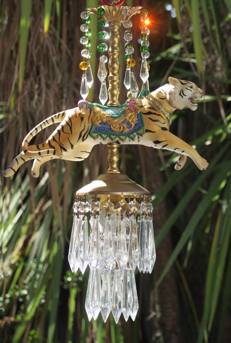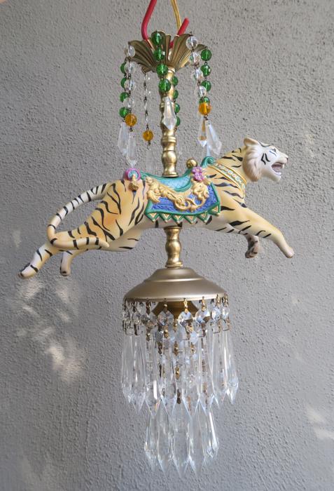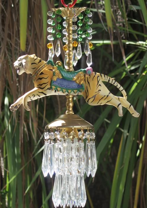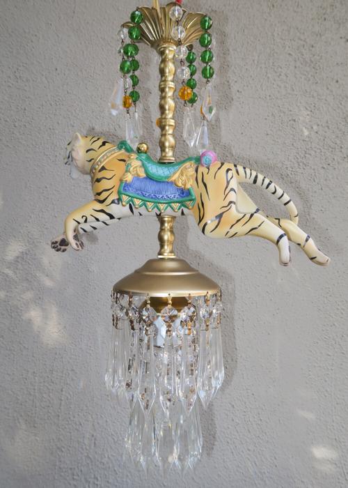 A beautiful porcelain Tiger chandelier-dripping with Sparkling European clear Crystal Prisms. Jeweled porcelain circus tiger with relief gilt enameled designs on the post. Dripping crystals at the top bobeche along with clear crystal prisms and glass purple and topaz bead garland strands; The metal is a combination of tole painted gold tone and cast brass. This is a one light fixture that takes a standard base bulb (not incl.) New wiring , has a loop at the top and - comes with 35" long electrical cord with canopy set with mounting hardware and 12.5" chain length - ready to hang in your home. The sale is for one fixture only - as shown. Fully working condition; porcelain horse in great condition; All prisms are intact, no chips, cracks etc.total measures 18.5" tall by 11" wide