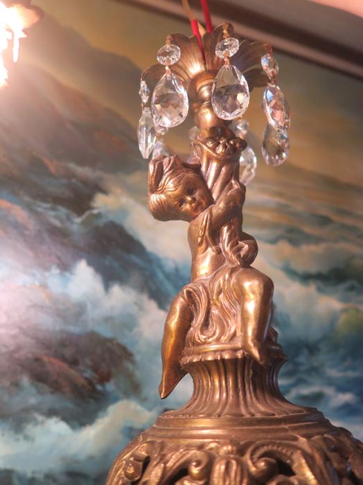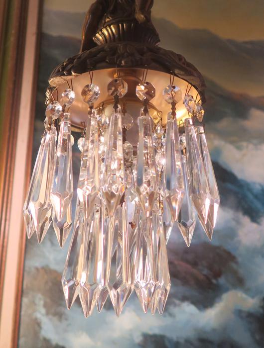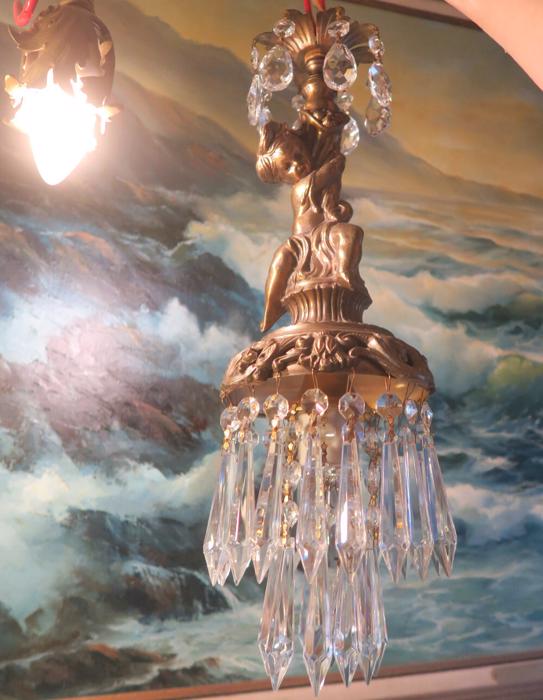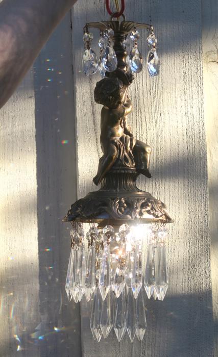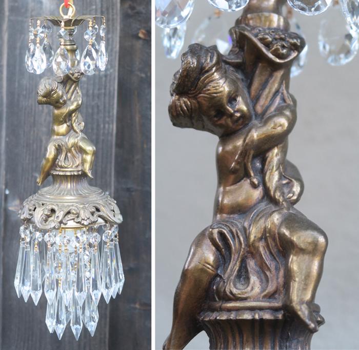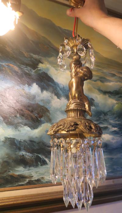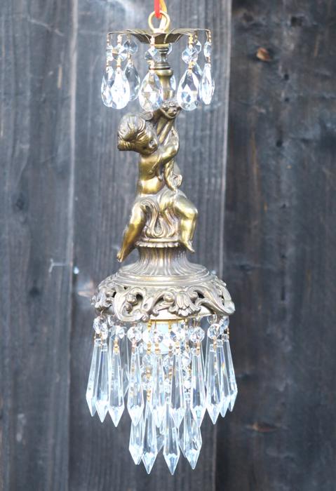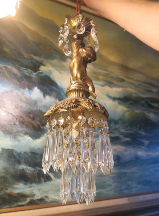 A beautiful Victorian Era Inspired pendant ceiling mount with canopy set lamp cherub light fixture -dripping with Sparkling , Glitzy .... French U-Drop European Crystal Prisms. Cherub post with delicate metal leaf bobeche at the top with crystal prisms. The metal is a combination of spelter like cast metal and tole ware metal with gold painted finish.Tiers and tiers of Cascading French U-drop Clear crystal prisms. This hanging fixture takes a standard base size bulb (not incl). Has a loop at the top for hanging , This is a ceiling install fixture that comes with a 30" long electrical cord with canopy set with mounting hardware and 12.5" chain length - ready to hang in your home. The sale is for one fixture only.; New wiring, All prisms are intact, no chips, cracks etc. total measures about 17.5" tall x 6" at the widest point