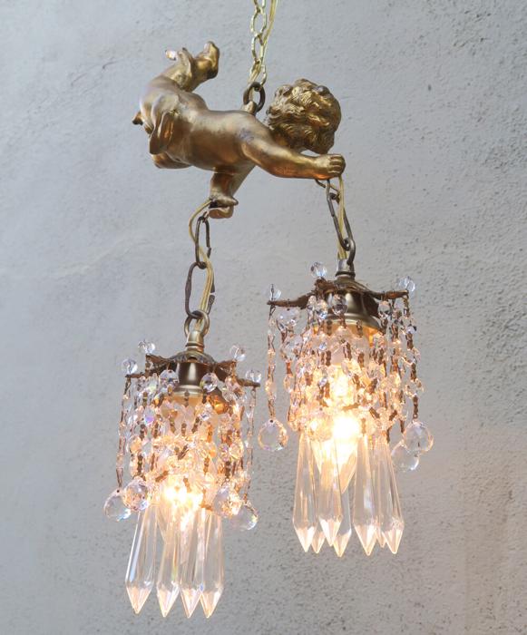 An adorable Vintage Chandelier French Italy Lamp Flying Cherub Tole Brass Crystal 2-lite swag plugin fixture; beaded lanterns with Dripping Crystal prisms Great accent light! Original gilding~ NEW WIRING!Offered this Beautiful hanging gilt Florentine Italian CHERUB putti chandelier-hanging ceiling lighting fixture Swag Plugin chandelier. Amazingly beautiful adorned with dripping clear crystal prisms and Sparkly cut crystal balls. The cherub which is made of toleware meta with original gilding gilt leafed Florentine surface is holding two lily flower shaped lanterns with dripping prisms in his hands. The light is in shape of a lantern with cascading tiers and tiers of French U-drop prisms and crystal ball accents. This hanging fixture takes a standard size bulb - 2 of them up to 150 watt each (not incl). This is a two-light fixture. Ready to hang in your home; Comes with a 9 foot long cord with switch in line and plug at the end and a chain lacing thru the cord- ready to hang in your home; It can be easily used as a ceiling fixture if a canopy added to it. A Very Unique Accent light fixture! Fully working condition; No missing, cracked broken pieces. All prisms are intact, no missing crystals, no chips, cracks etc.The chandelier total measures about 19" tall x 10" at the widest point ; Cherub sculpture itself measures 10.25" at the widest point