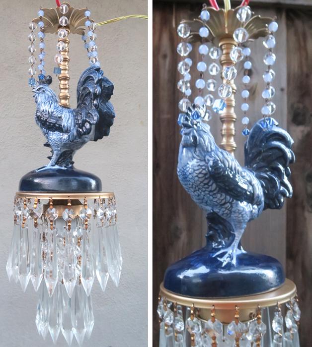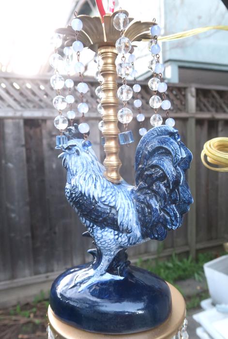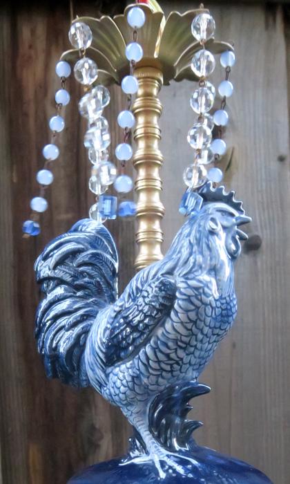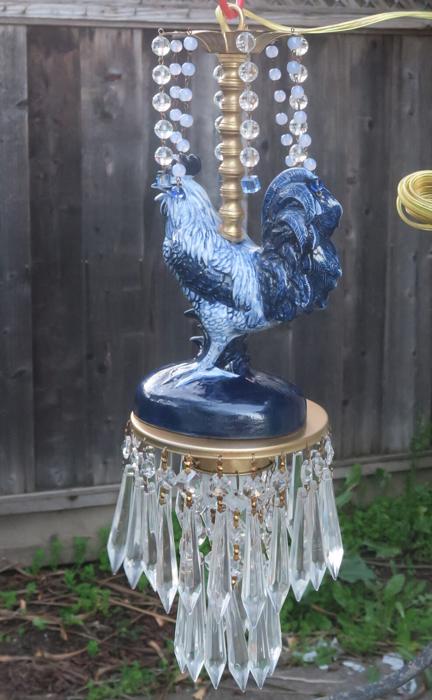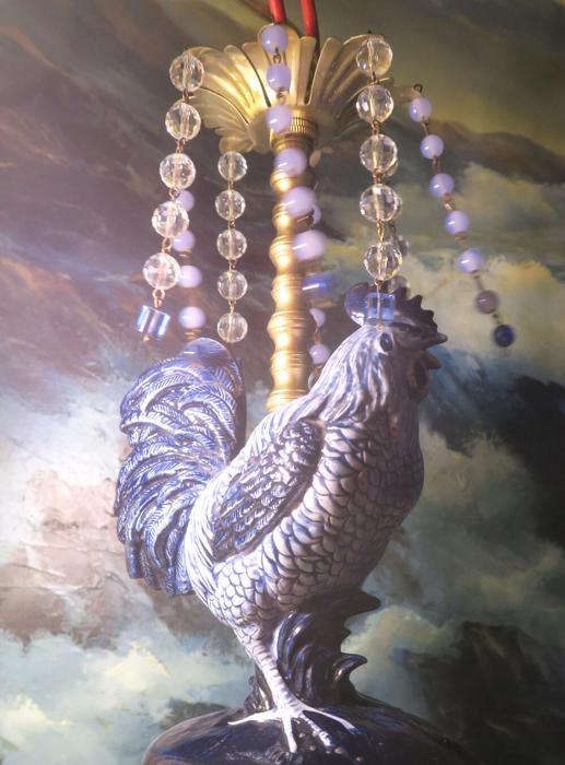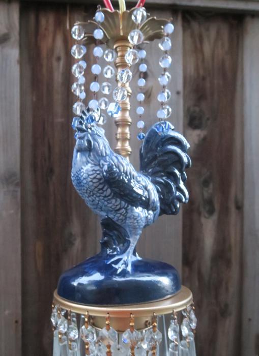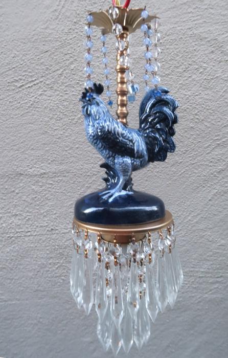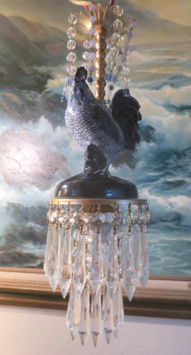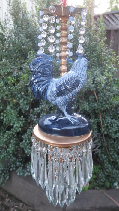 Vintage Rooster Chicken porcelain Carousel SWAG Lamp Chandelier Dutch Delft Blue plugin Chandelier Vintage beads Tole & brass metal crystal ~ Sparkling.... Crystal Prisms A wonderful unique handpainted porcelain Rooster chandelier-dripping with Sparkling , Glitzy .... European clear Crystal Prisms. Dripping orange and blue opaline bead garlands at the top bobeche along with clear crystal prisms. A True Sparky wonder! A double layer of the large sized clear crystal glass prisms at the bottom of the fixture; The metal is a combination of tole painted gold tone and cast brass. New wiring and porcelain socket that takes a standard base size bulb(not incl.), has a loop at the top and - comes with 9' foot long cord with switch in line and plug at the end - ready to hang in your home. The sale is for one fixture only - as shown. Fully working condition; porcelain bird is in great condition; All prisms and beads are intact, no chips, cracks etc. total measures 17.5" tall by about 6.5" wide