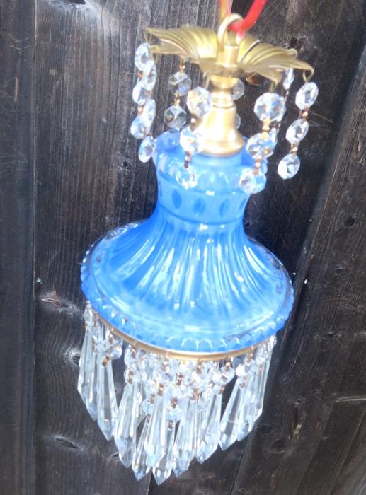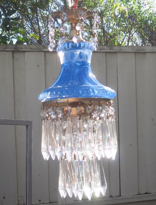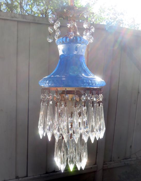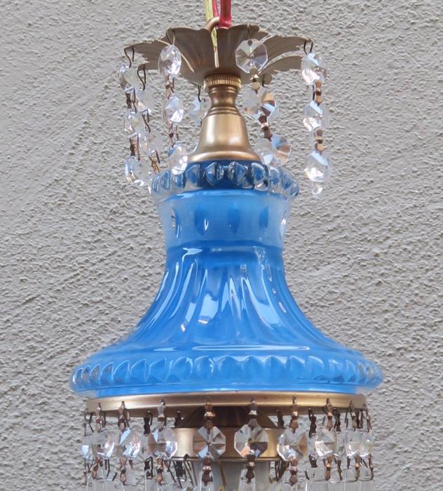 Hanging pendant lamp with Sparkling large sized prisms. Great looking with Sail water Blue ribbed glass with double tiers of Cascading pendant French icicle -drop Clear prisms that put out a rainbow Sparkle. Adorned with opaline Blue beads. The metal is a combination of brass and gold painted tole metal. This hanging fixture takes standard base size bulb up to 150 watt (not incl). It is a ceiling fixture. Comes with a 30" long electrical cord and a canopy set with mounting hardware and 12.5" chain length- ready to install in your home. New wiring and porcelain socket; The sale is for one fixture only. Fully working condition; All prisms and glass and are intact, no chips, cracks etcMeasures 14" tall by 6" wide