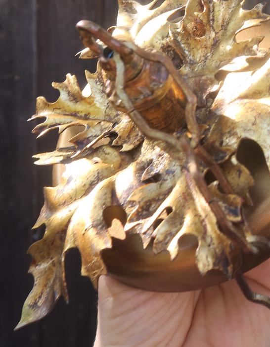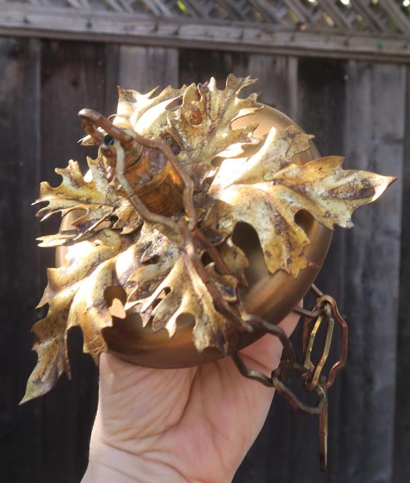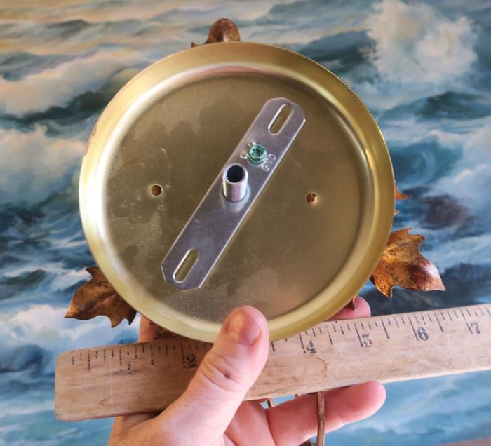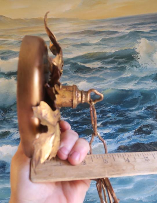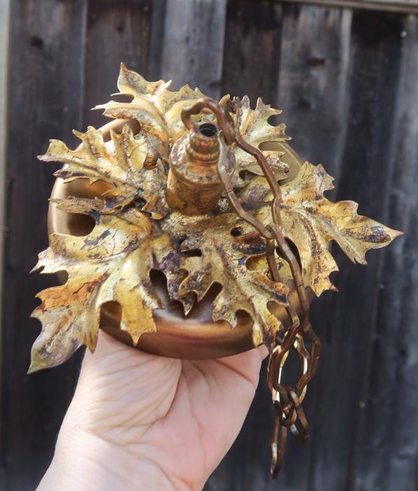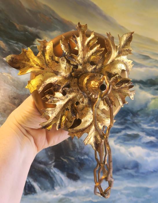 1 Vintage canopy ~ Italian gilt Tole Metal Ceiling cap with chain hanging lamp chandelier part set. Beautiful original gold leaf on the ornate relief acanthus leaf. Please refer to the photos for the measurements**** the Chain Measures about 12" long. Vintage ceiling canopy with mounting hardware part set - a great part to use to hang your lamp or chandelier;