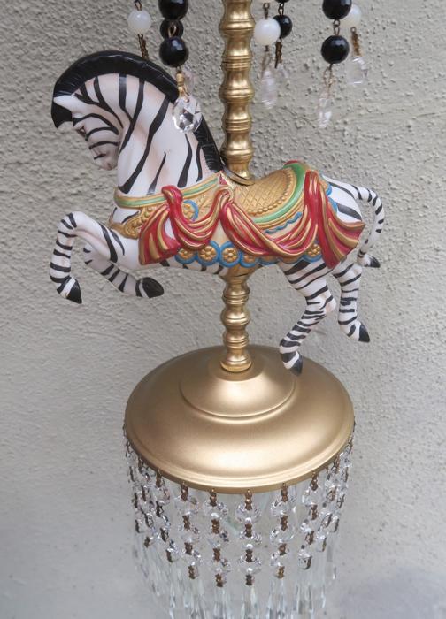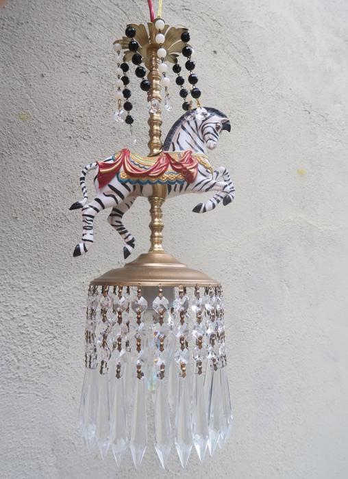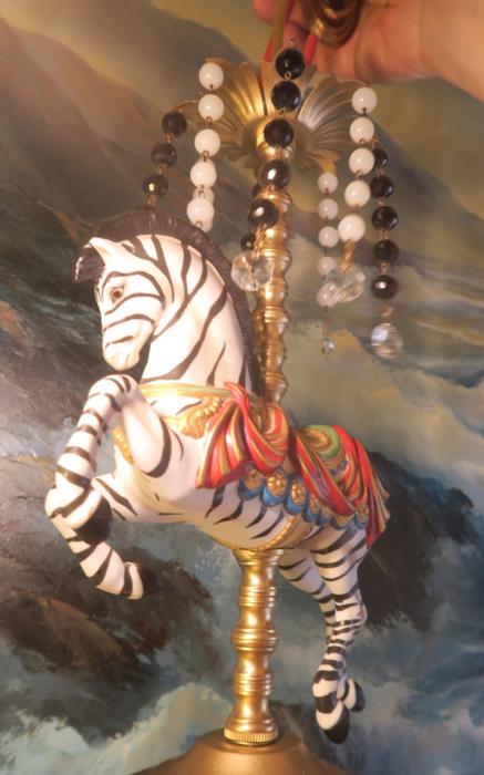 Zebra Porcelain Carousel Lamp SWAG Chandelier Vintage opaline white and black bead strands, Sparkling Crystal prismsA beautiful absolutely unique porcelain Zebra chandelier-dripping with Sparkling European clear Crystal Prisms. Jeweled porcelain zebra with relief gilt enameled designs on the post. Dripping crystals at the top bobeche along with clear crystal prisms and glass bead garland strands; The metal is a combination of tole painted gold tone and cast brass. This is a one light fixture that takes a standard base bulb (not incl.) New wiring, has a loop at the top and - comes with 9' foot long cord with switch in line and plug at the end - ready to hang in your home. The sale is for one fixture only - as shown. Fully working condition; porcelain zebra in great condition; All prisms are intact, no chips, cracks etc.total measures 17.5" tall by 7.5" wide